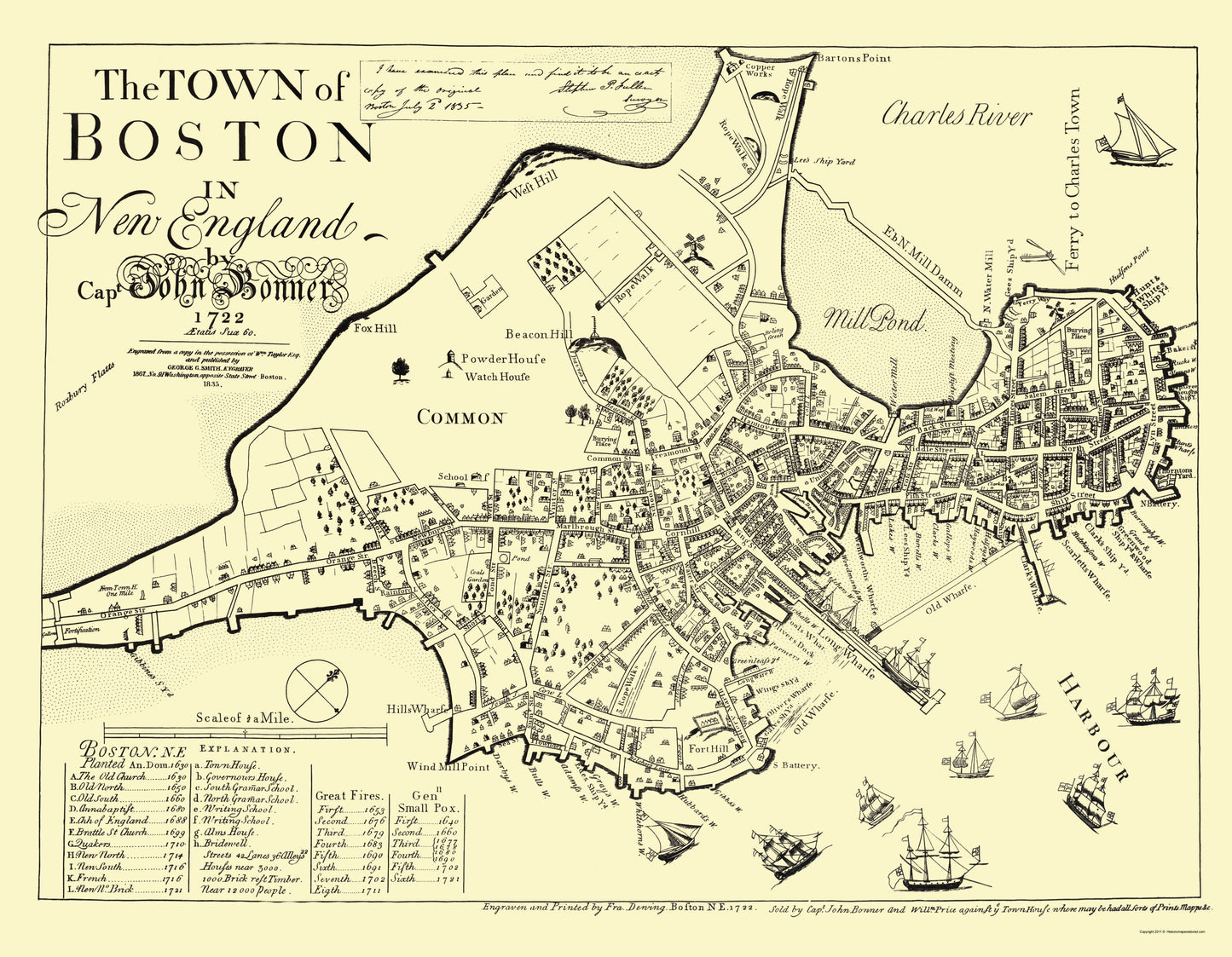 The following towns are featured: an Explanation table with locations and dates with letters of The Old Church, Old North, Old South, Annabaptist, Church of England, Brattle St Church, Quakers, Nen North, Nen South, French, Nen No. Brick, Town House, Governours House, South Gramar School, North Grammar School, Writing School, Alms House, and Bridewell. Also shown are the dates of the first through the eighth Great Fires and the first through the sixth General Small Pox outbreaks. Warves are named along with many of the major streets, commons, and hills.