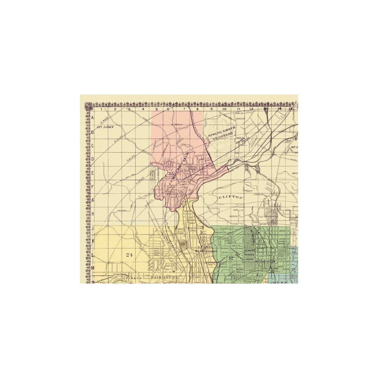 Sites and Townships Specific To This Map Are: Townships/Districts of: Cumminsville, Clifton, St. bernard, Shaprsburg, Oakley, Avondale, Woodburn, Mount Lookout, Fairmont, Mount Auburn, Walnut Hill Pendleton, Mount Tusculum, Columbia, Turkey Botton, Ludlow, West Covington, Covington, Newport, Bromley & California.