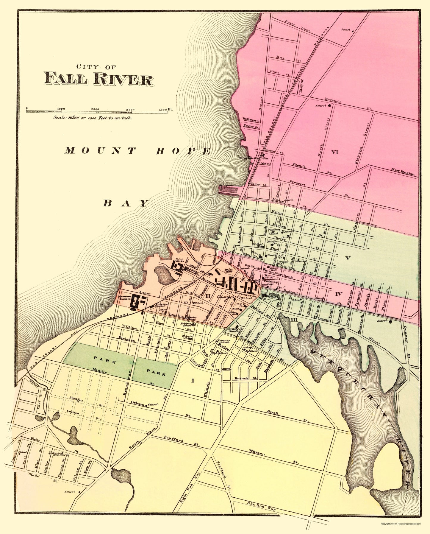 The following towns are featured: many labeled streets, Mount Hope Bay, QueQuechan River, Old County and New Port Railroad, Park, Schools (ex. Robonson School, Primary School, High School and more), City Hall, Post Offices, Churches (ex. St. Mary's Church, Mission Chapel, Unitarian Church and more), Music Hall, Passenger Station, Bank, White Mills, Print Works, City Hotel, Mt. Hope House and American Linen Company.