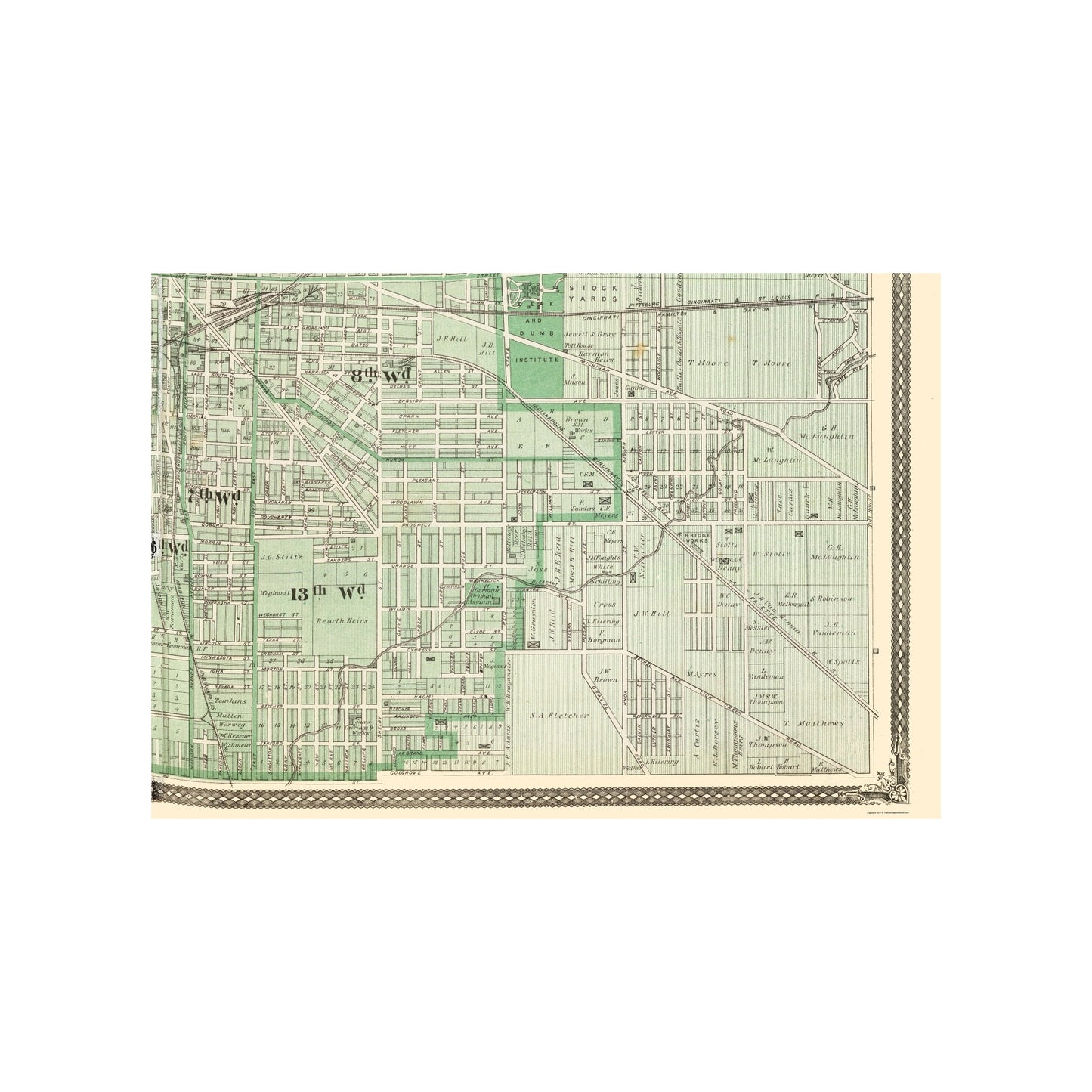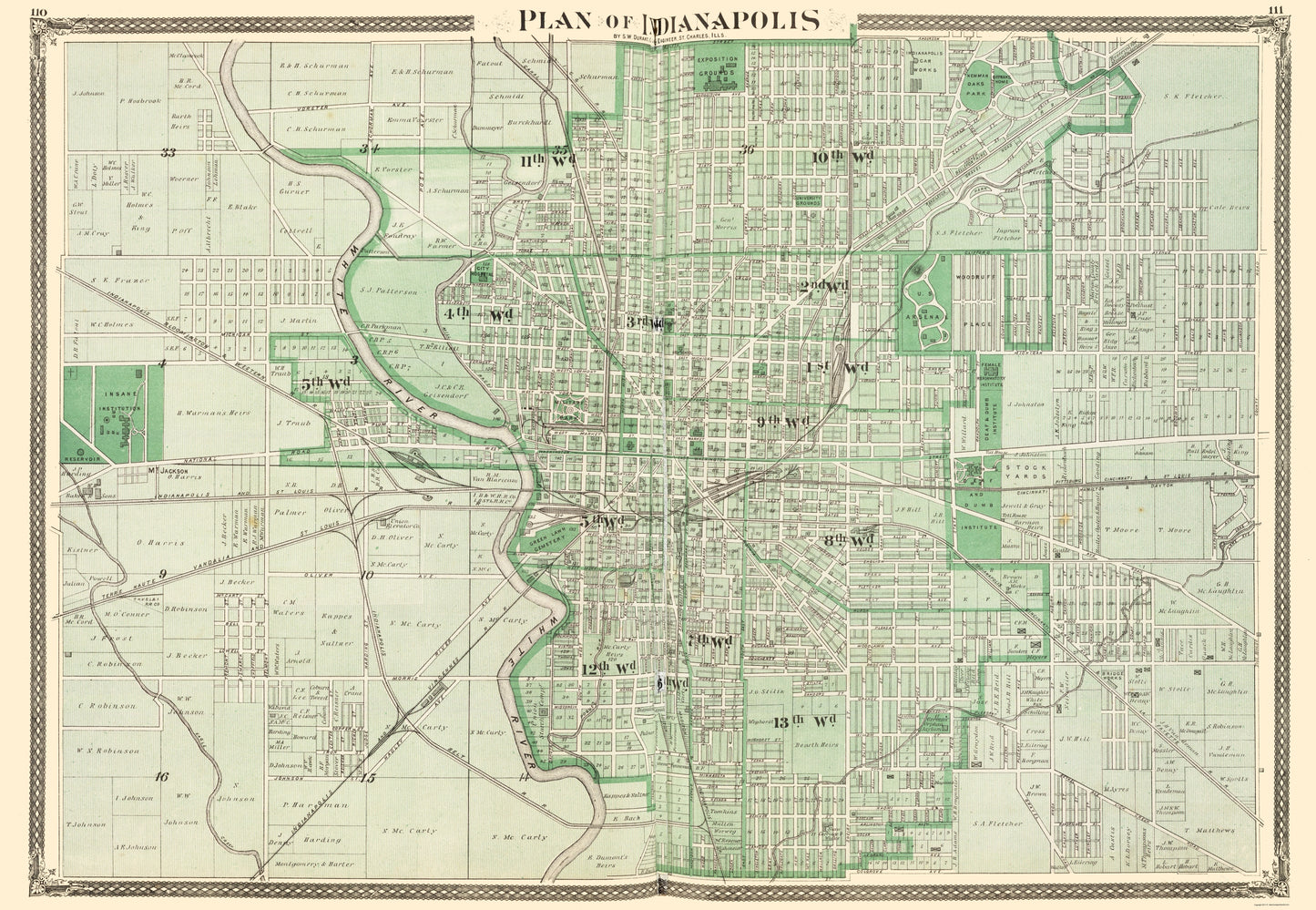 The following towns are featured: the city of Indianapolis and its first through thirteenth wards separated by color and property line. Also shown are the names of many different landowners separated by property line. Some landmarks of interest are the Insane Institution, Woodruff Plage, U.S. Arsenal, Deaf and Dumb Institute, Stock Yards, and the Indianapolis and Vincennes Railroad.