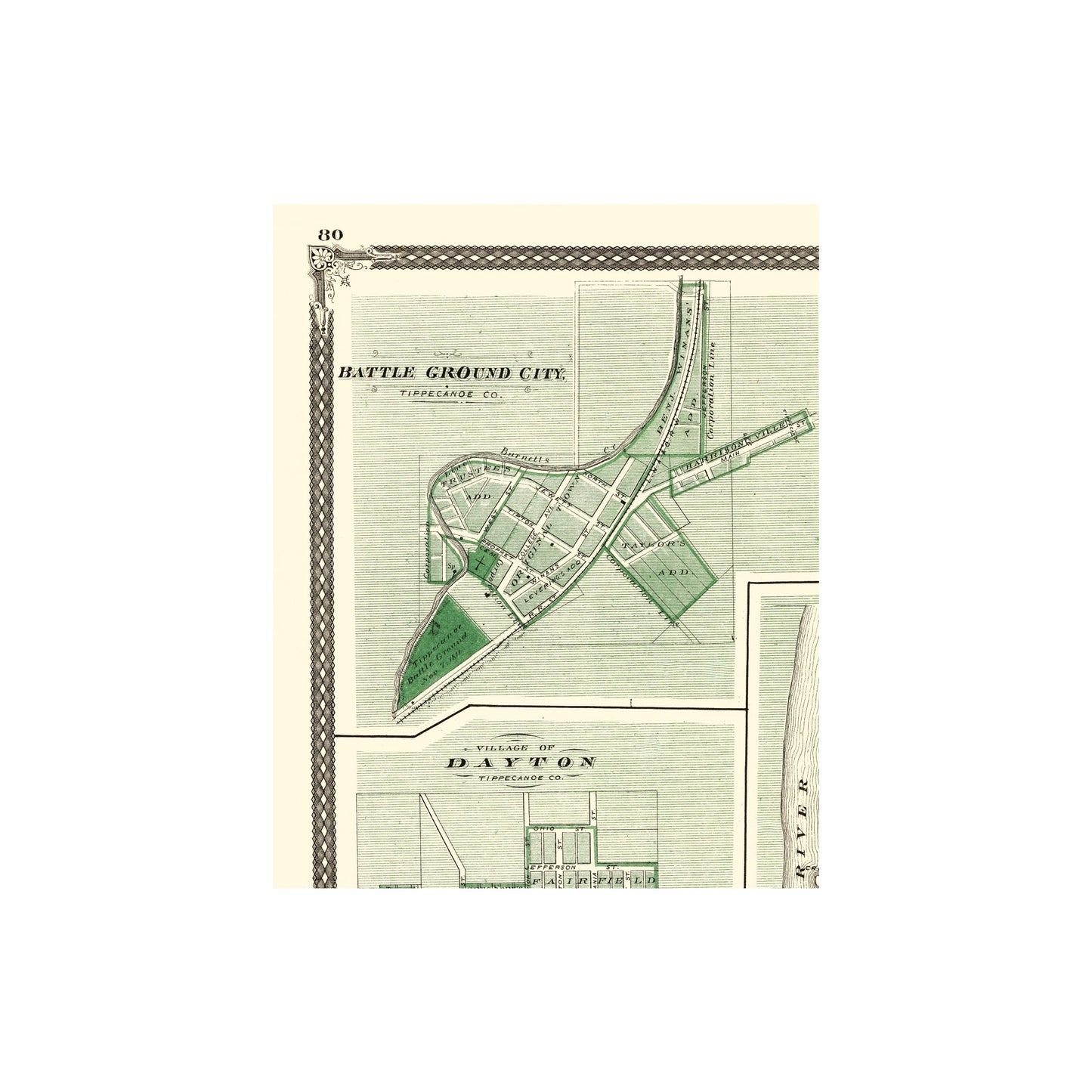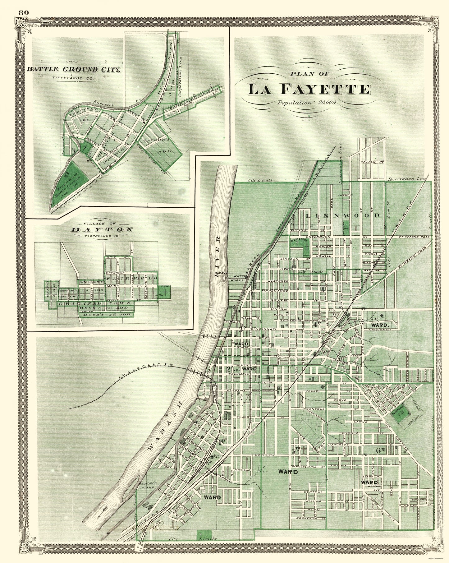 The following towns are featured: the Indian cities of La Fayette, Dayton and Battle Ground. La Fayette is the largest city displayed and boasts the highest detail of the three maps. Features of note there include: First - Sixth Ward, Wabash River, Wabash & Erie Canal, Reservoir, Bedfords Island, T. W. & W. Railroad, Union St., Oakland Ave., South St., cemeteries and city limits. The cities of Battle Ground and Dayton include the features: Burnetts Creek, Tippecanoe Battle Ground, labeled streets and basic outlines for city limits.