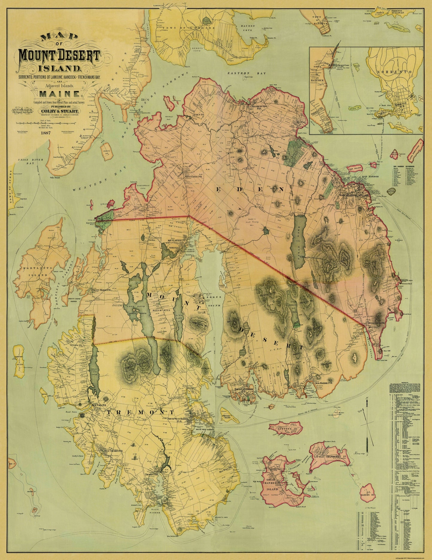 Sites and Townships Specific To This Map Are: Hundreds of Named Landowners. Mount Desert Island, Sorrento, Portions of Lamoine, Hancock, Frenchman's Bay and Adjoining Islands, Great Pond Hill, West Peak, East Peak, Interiaken Hill, Eden Street, Blunt's Pond, Oak Point, Bartlett's Island, Goose Cove, Union River Bay, Churches, Schools and Many Other Prominent Buildings.