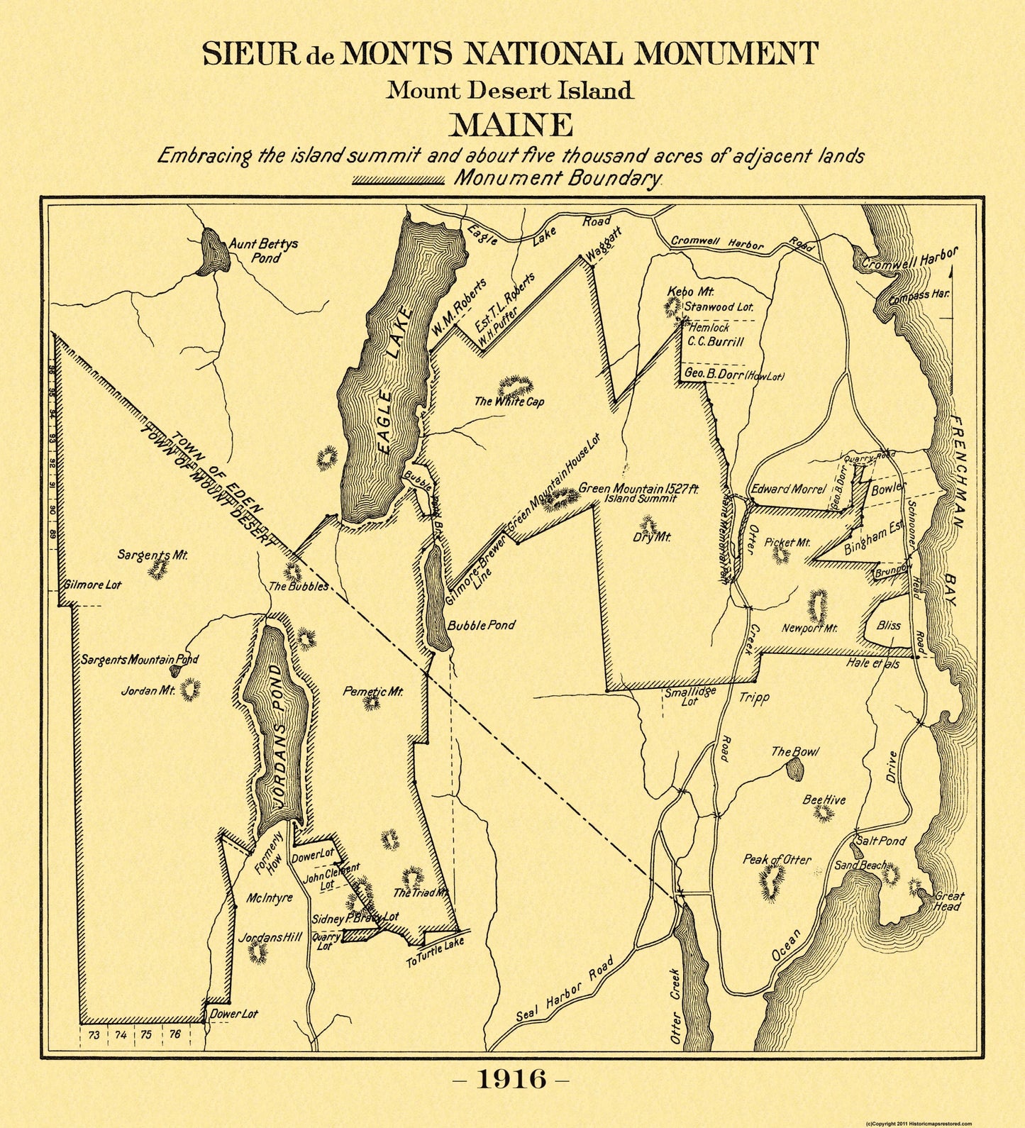 Sites and Townships Specific To This Map Are: Green Mountain, Dry Mountain, Eagle Lake Road, Ocean Drive, Seal Harbor, Eagle Lake, Frenchman Bay, Jordan Pond, and Cromwell Harbor.