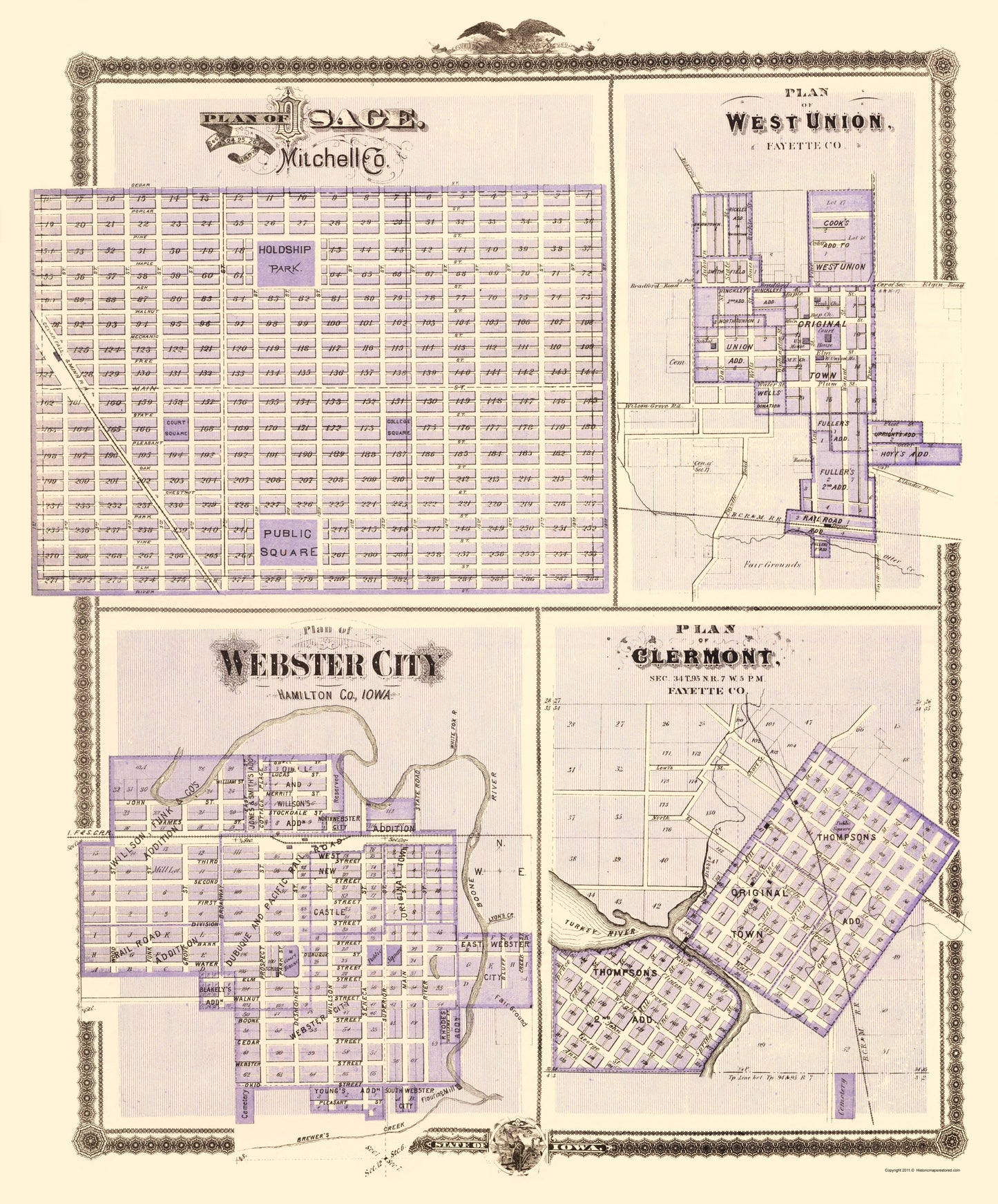 The following towns are featured: Plats of four city maps:Webster City (Hamilton CO), Osage (Mitchell CO), West Union (Fayette CO), and Clermont (Fayette CO).The map of Osage features: Holdship Park, Court Square, College Square, Public Square, Cedar Falls & Minn R.R., named roads and numbered plats.The map of West Union features: Original town, additions by name, court house, named roads, numbered plats, B.C.R. & M. R. R., Fair Grounds, Otter Creek, School, Baptist Church, Methodist Episcopal Church, Presbyterian Church and cemetery.The map of Webster City features: Original town, additions by name, court house, named roads, numbered plats, White Fox River, Boone River I. F. & S. C.R.R., Dubuque and Pacific Rail Road, Public Square, Fair Grounds, Flouring Mill, Brewer's Creek, Lyon's Creek, school and cemetery. The map of Clermont features: Original town, additions by name, court house, name