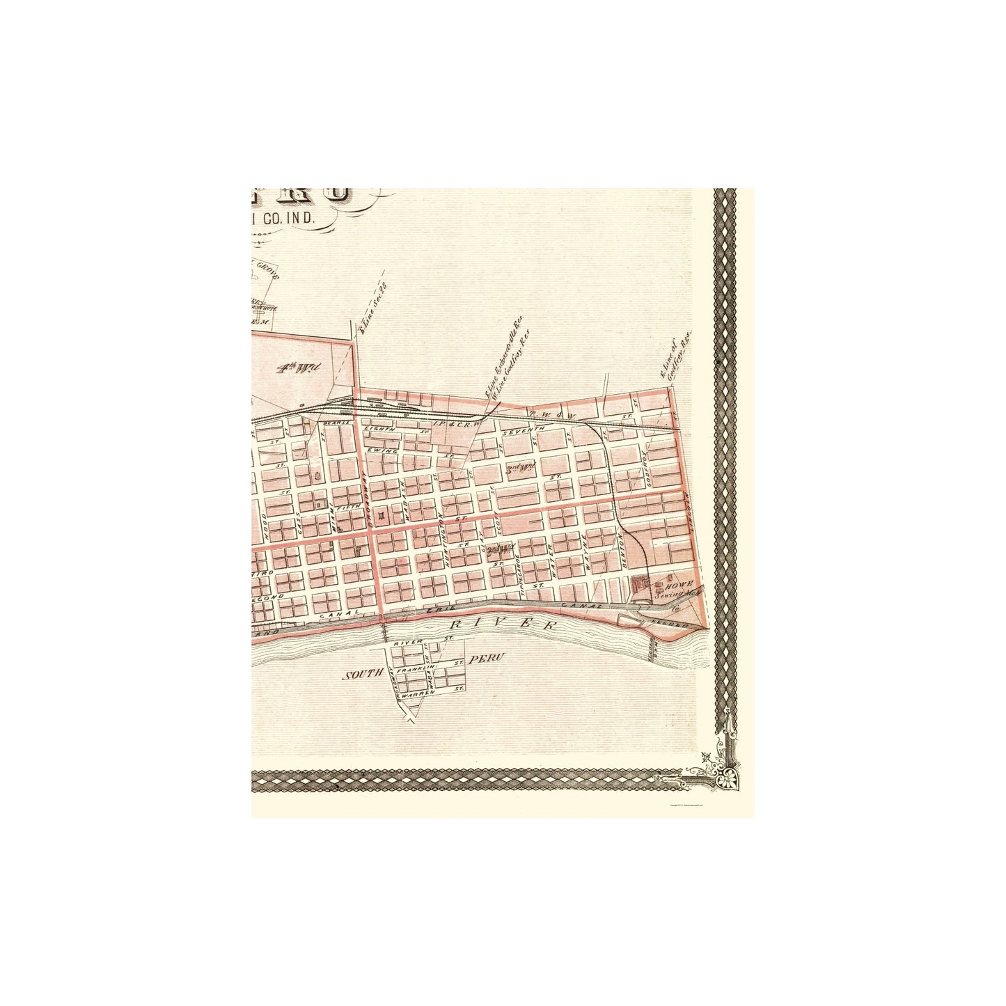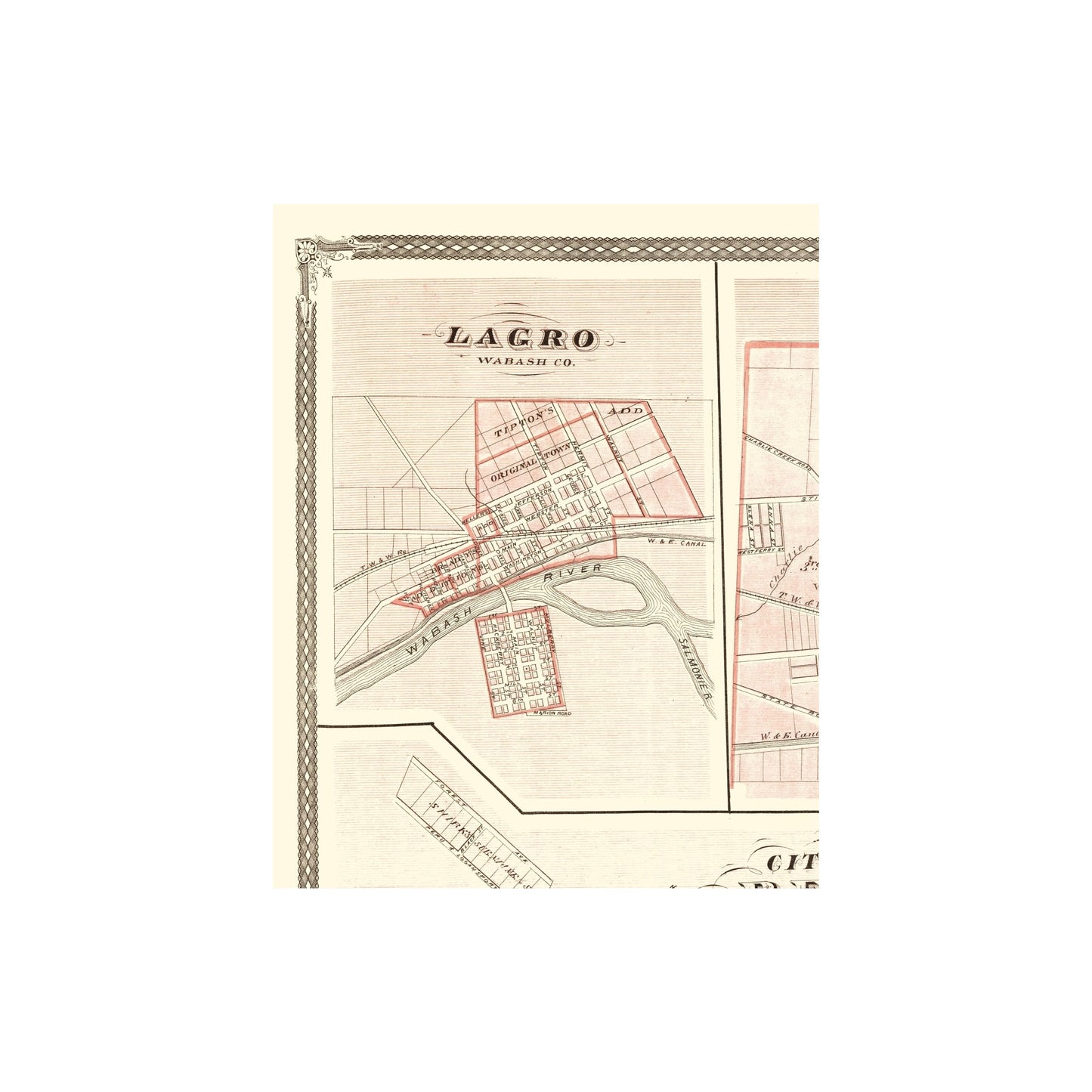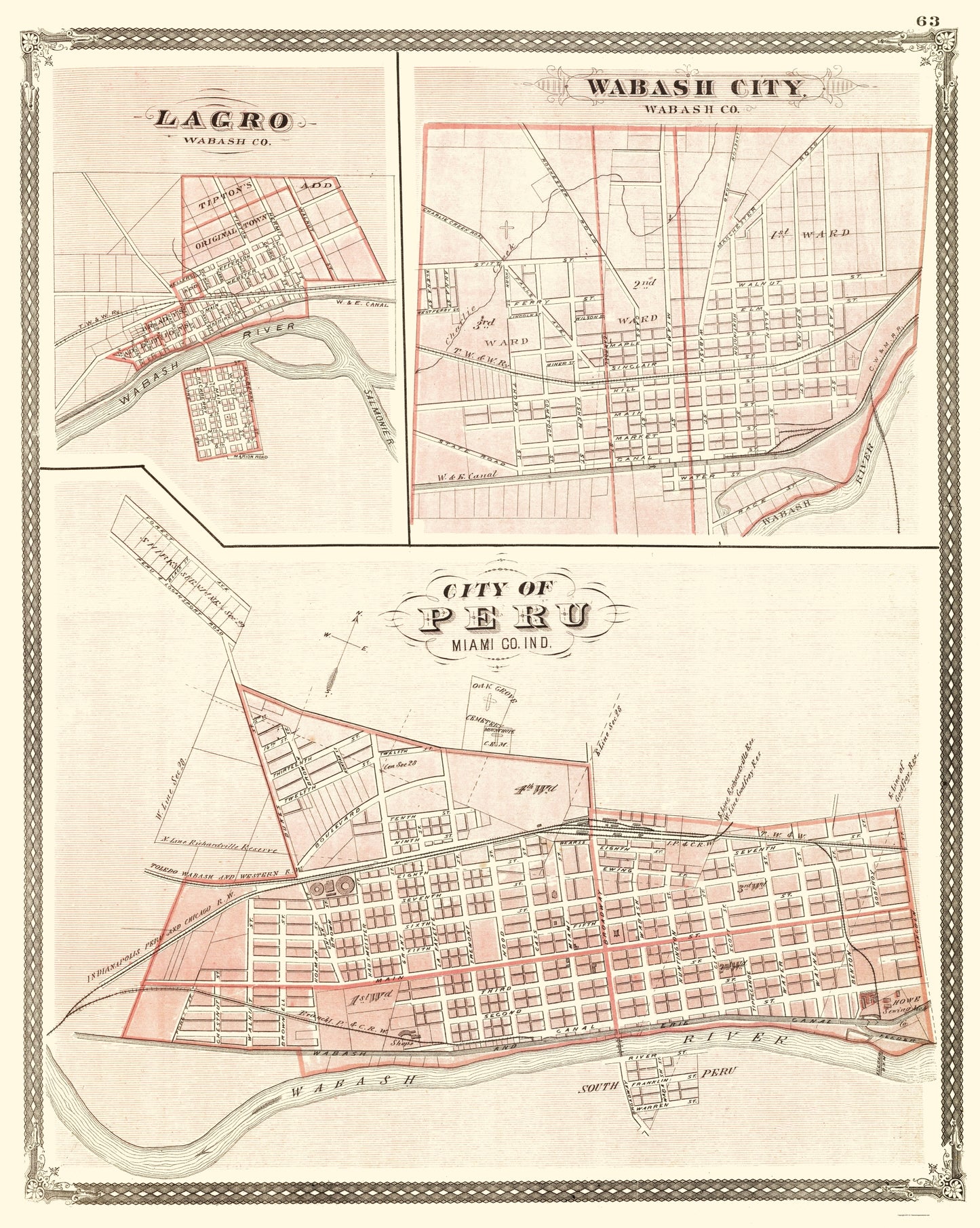 The following towns are featured: insets of the towns of Peru, Lagro and Wabash City, Indiana, (IN) along with additions to each of the towns. Some landmarks of interest are the Wabash River, Salmon River, Indianapolis, Peru and Chicago Railway, Toledo, Wabash and Western Railway, Wabash and Erie Canal Feeder, and named streets.