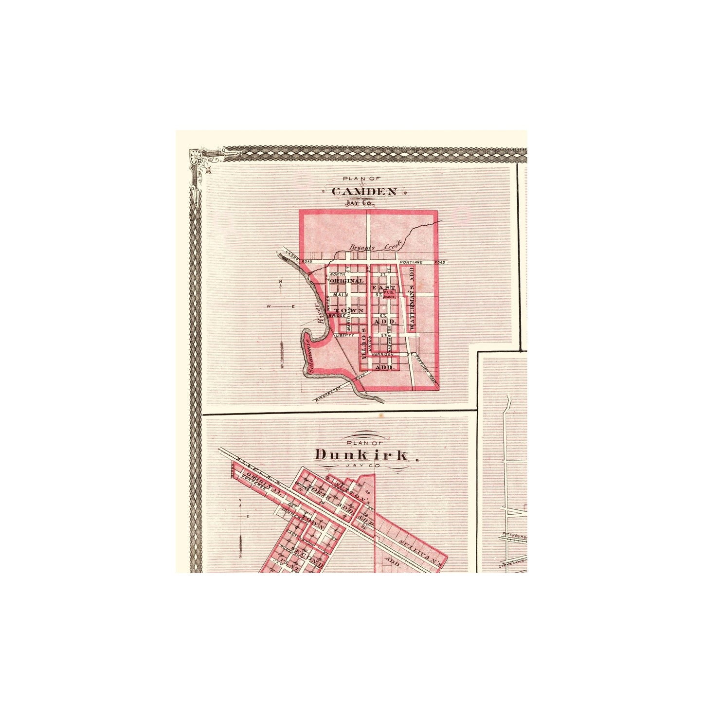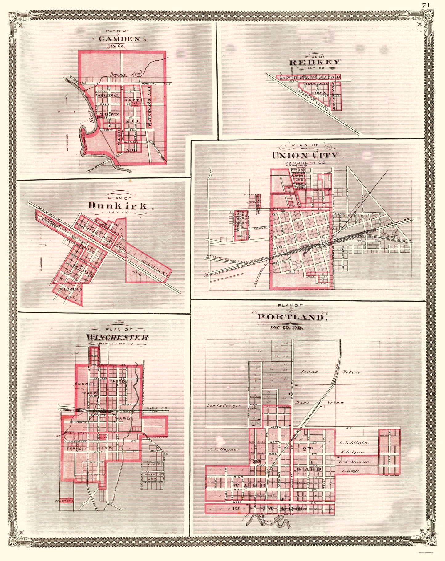 Print Size: 23.00 x 28.98 inches58.42 X 73.60cm ter, Union City, Dunkirk, Redkey and Camden, Indiana, (IN) along with labeled additions for each town. Some landmarks of interest are the Salamonie River, Cleveland, Columbus, Cincinnati, and Indianapolis Railroad, Pittsburg, Cincinnati and Saint Louis Railroad, proposed railroads and named streets.