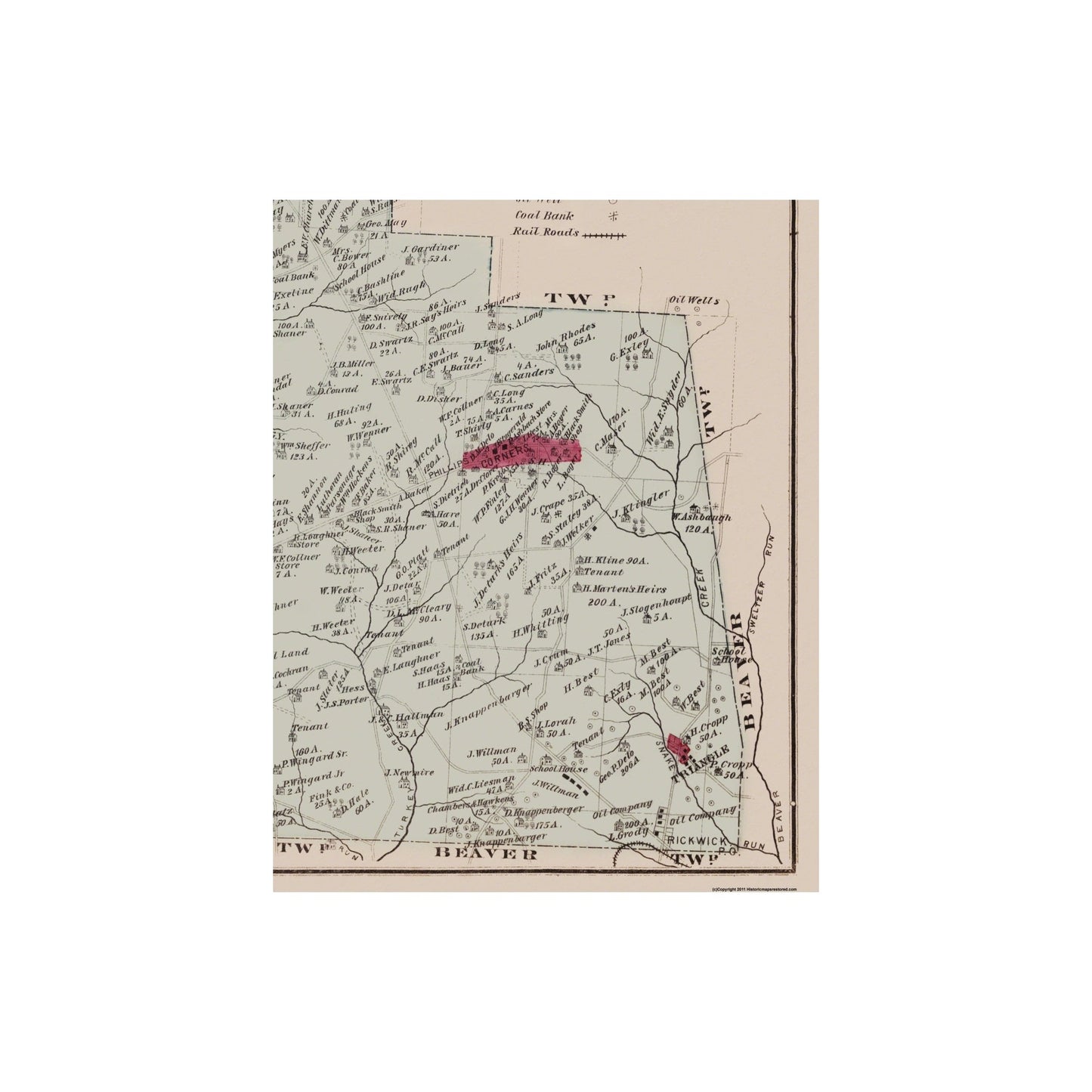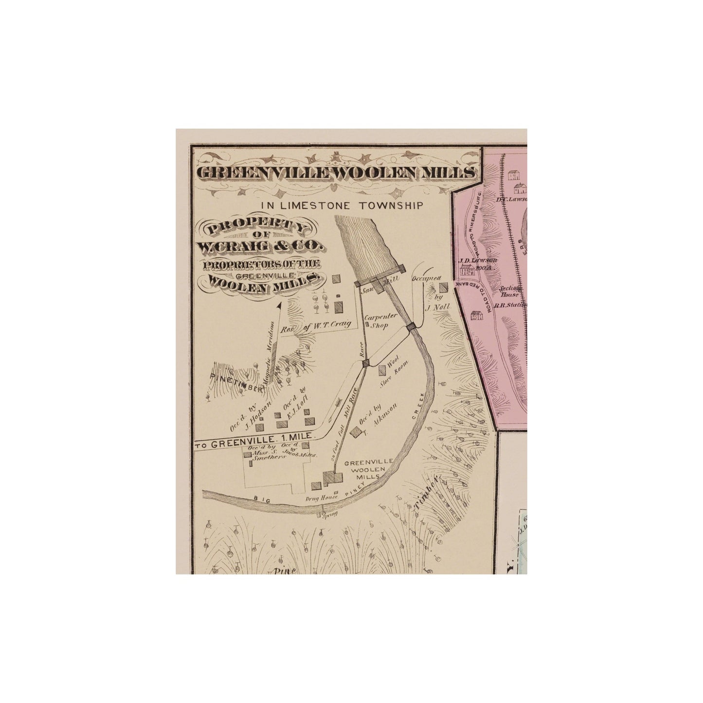 Sites and Townships Specific To This Map Are: Churches, Schools, Hotels, Coal Banks, Lime Stone Quarry, Turkey Creek, Snake Run, Beaver Creek, Named Landowners and References to Roads, Lanes, Streams, Houses, Orchards, Stone Quarries, Oil Wells, Coal Banks and Railroads. Also included in the map are inserts illustrating the town plans of Lawsonham, Greenville Woolen Mills and Centerville.