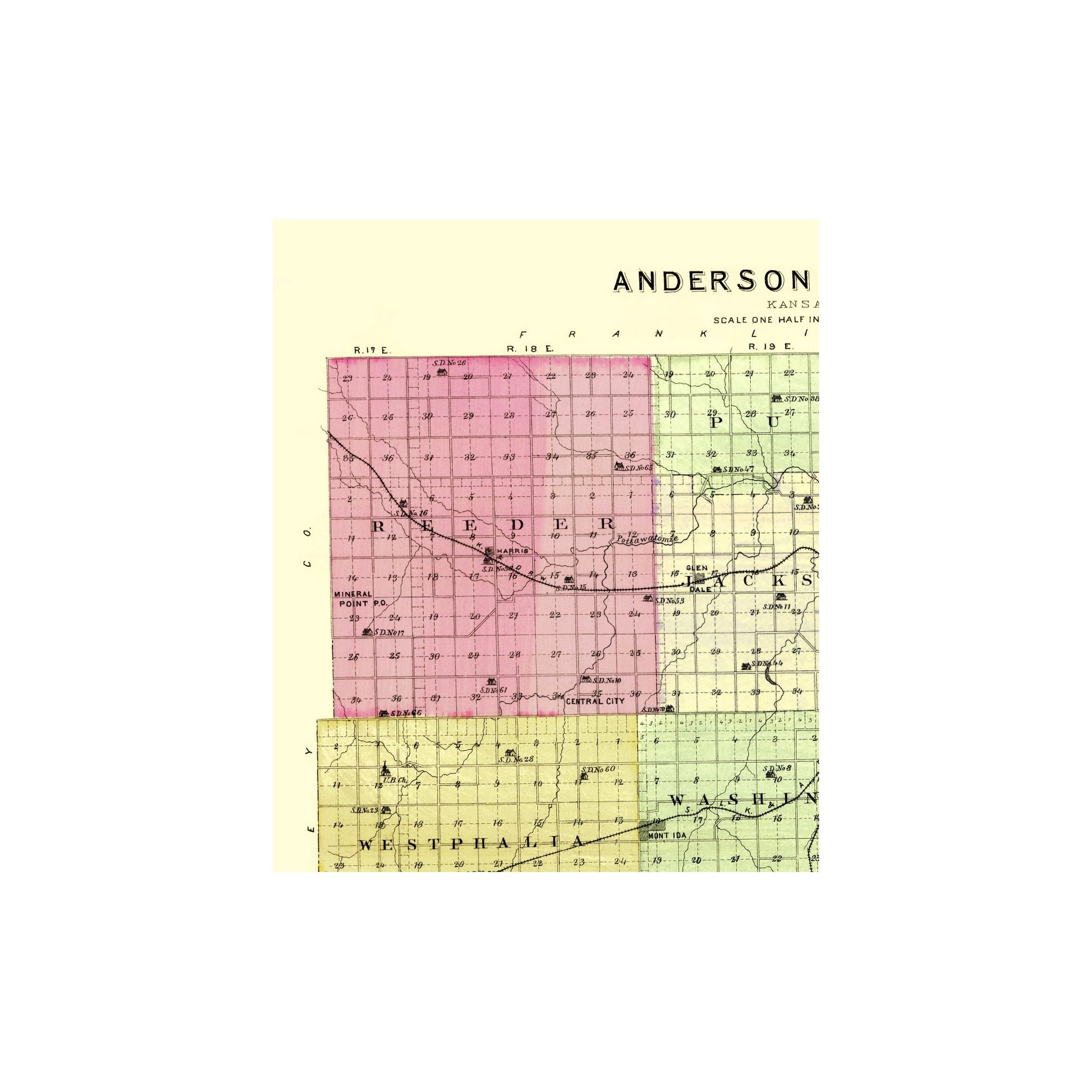 Sites and Townships Specific To This Map Are: Colony, Reeves, Welda, Westphalia, Mont Ida, Central City, Garnett, Harris, Grelley, Bush City, Laura, Kincade, Glen Dale.
