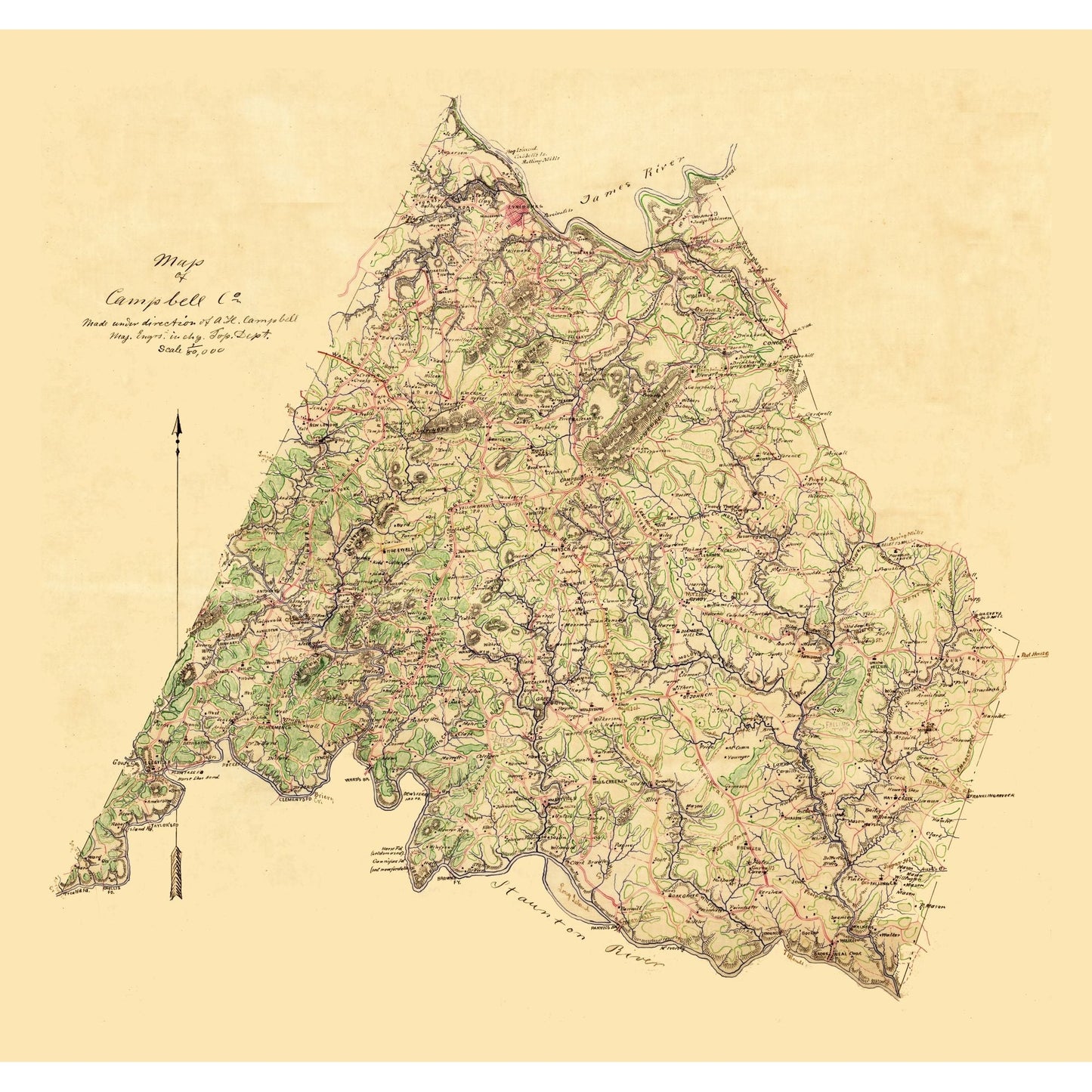 Old County Maps - Campbell County Virginia - Campbell 1860 - This is an exquisite full-color Reproduction printed on high-quality gloss paper, art paper or canvas.