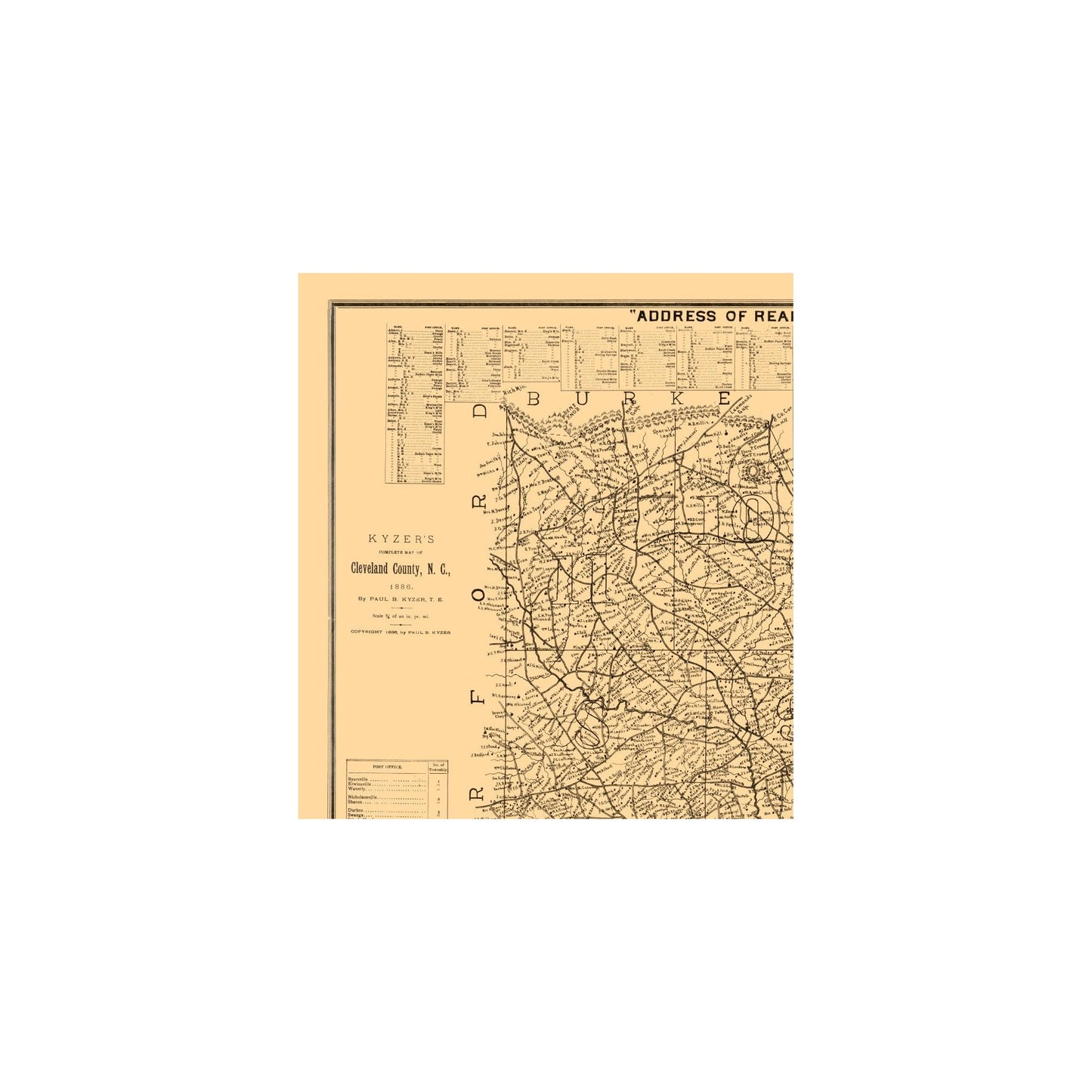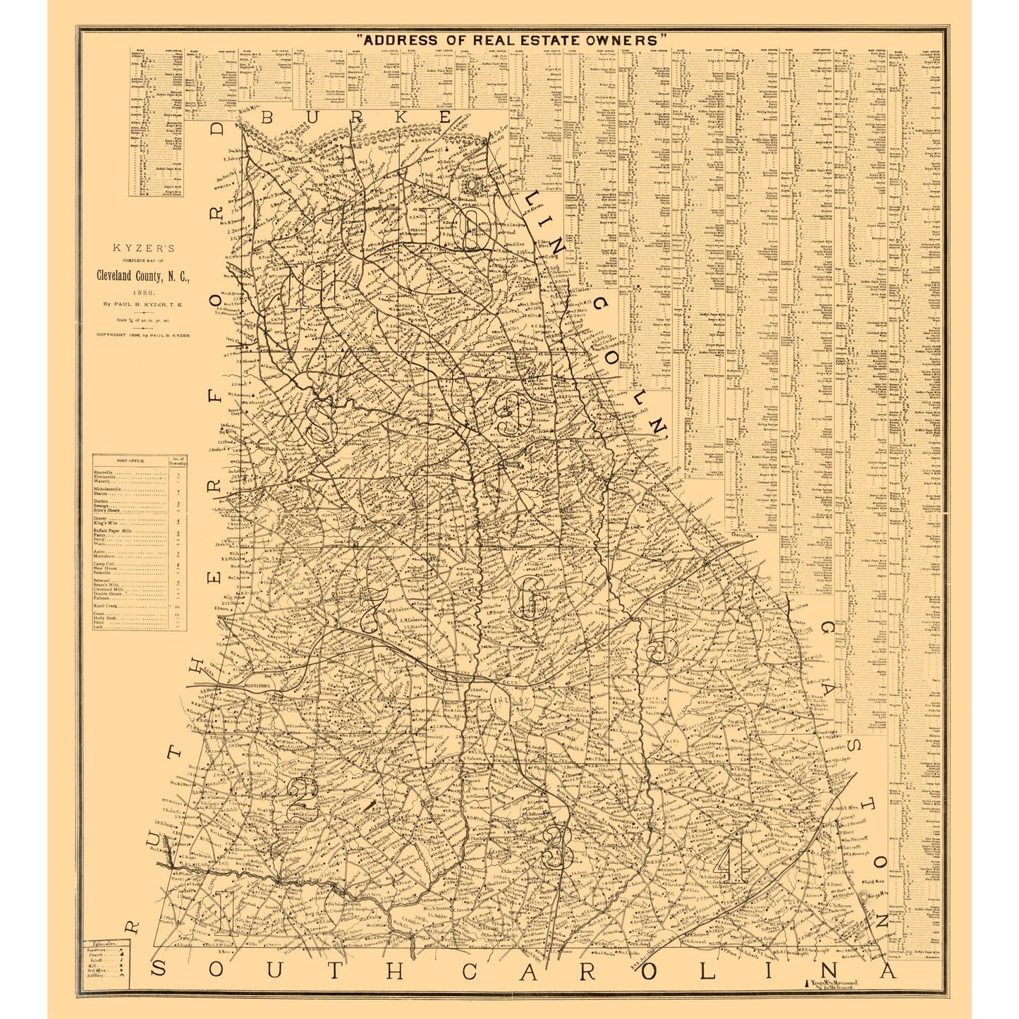 Old County Maps - Cleveland County North Carolina - Kyzer 1886 - 23 x 25.36 - This is an exquisite full-color Reproduction printed on high-quality gloss paper, art paper or canvas.