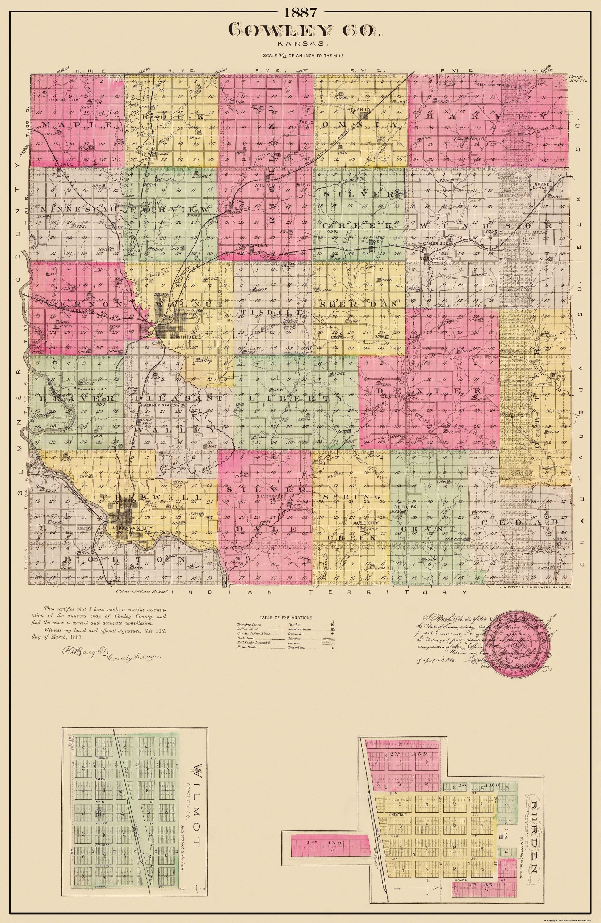 Historic County Map - Cowley County Kansas - Everts 1887 - 23 x 35.31 - Vintage Wall Art