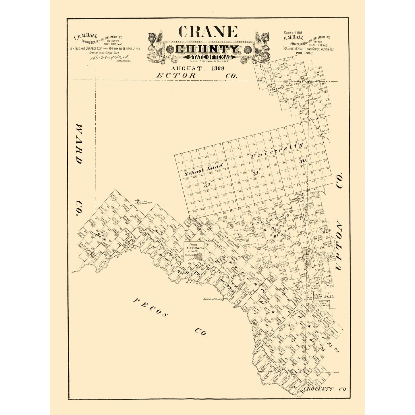 Historic County Map - Crane County Texas - General Land Office 1889 - 23 x 30.31 - Vintage Wall Art