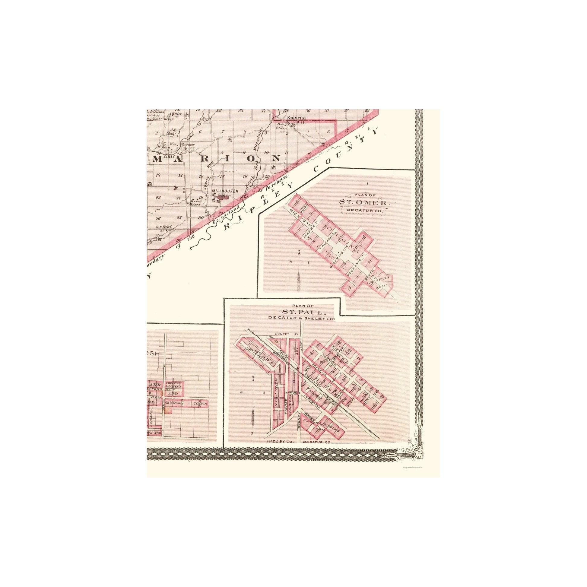 The following towns are featured: the townships of Clay, Washington, Salt Creek, Marion, Sand Creek, Jackson, Adams, Clinton and Fugit. Also shown are insets of the towns of Saint Omer, Saint Paul, Clarksburgh and New Point at the bottom. Some landmarks of interest are the Clifty Creek, Wyatoosing Creek, Millstone Creek, Sand Creek, Panther Creek, and Rock Creek.