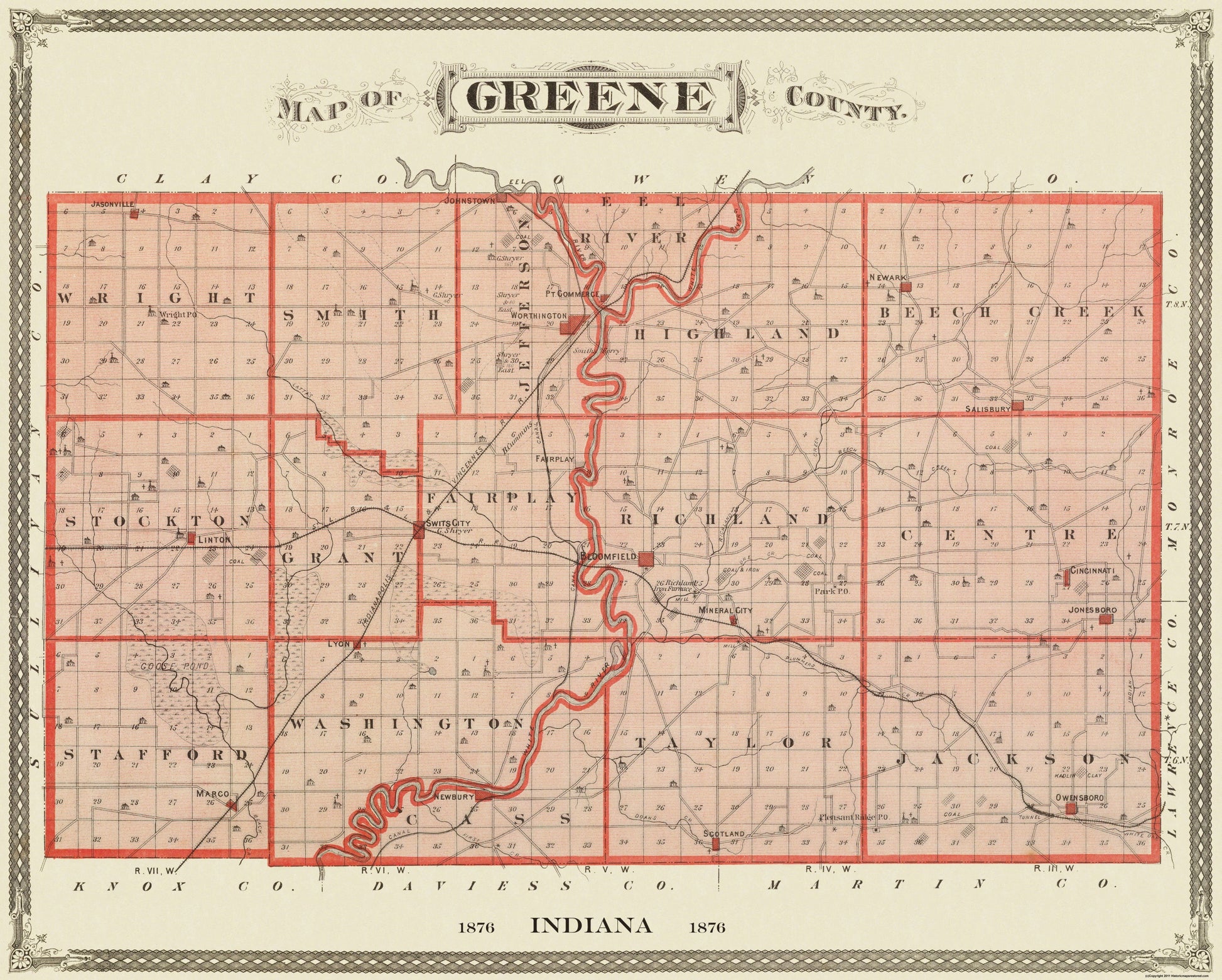 Historic County Map - Greene County Indiana - Andreas 1876 - 23 x 29 - Vintage Wall Art