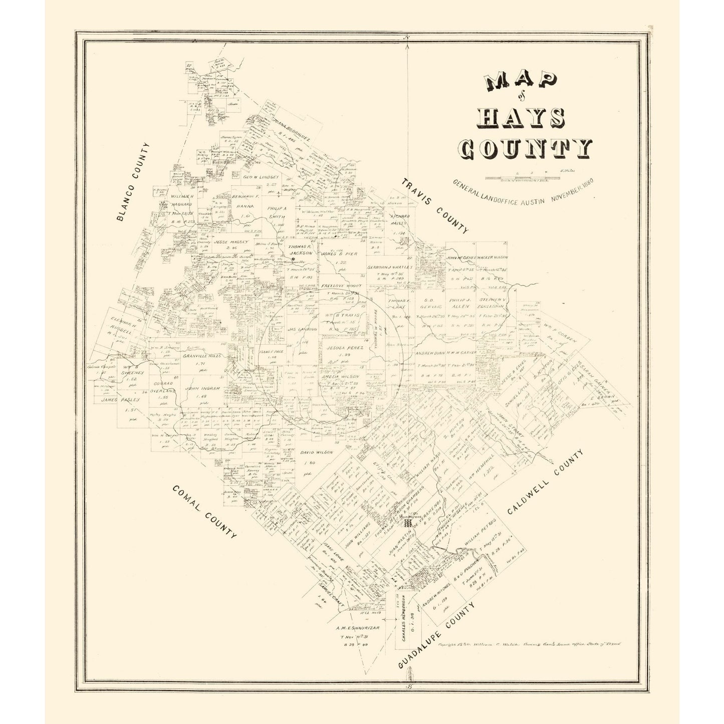 Historic County Map - Hays County Texas - Walsh 1880 - 23 x 26.25 - Vintage Wall Art