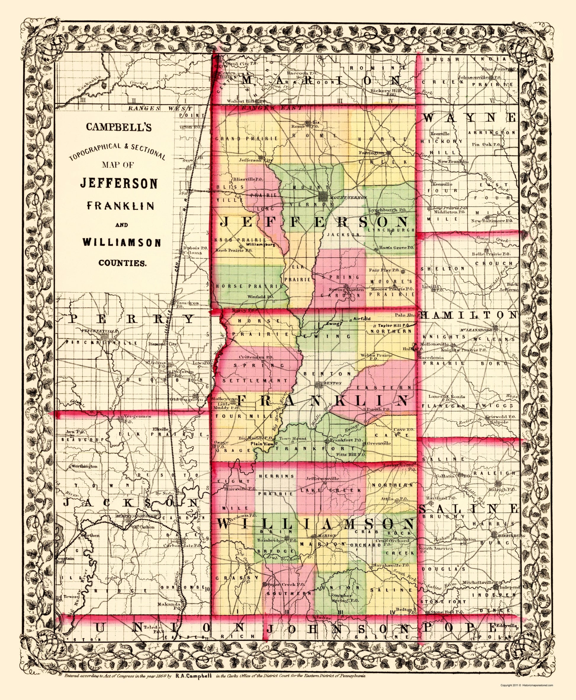 Historic County Map - Jefferson Franklin Williamson Counties Illinois - Campbell 1870 - 23 x 27.93 - Vintage Wall Art