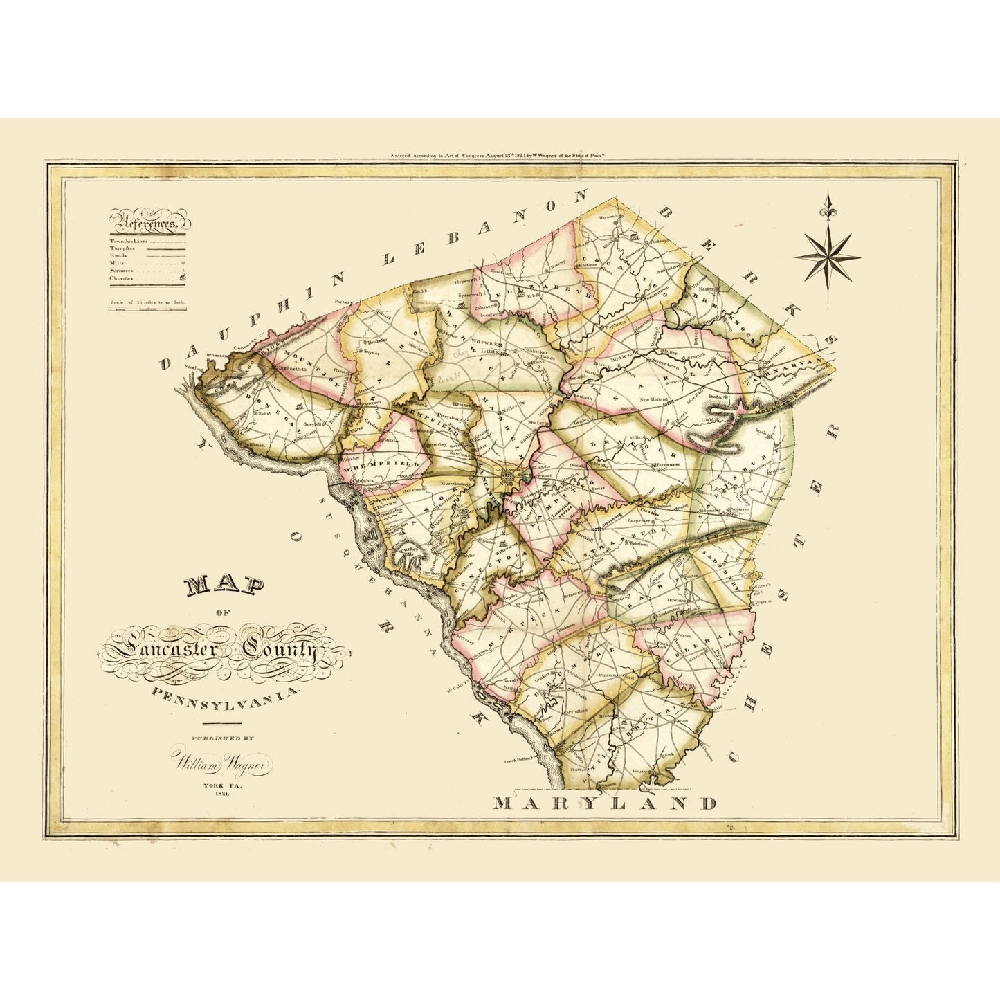 Historic County Map - Lancaster County Pennsylvania - Wagner 1821 - 30.08 x 23 - Vintage Wall Art