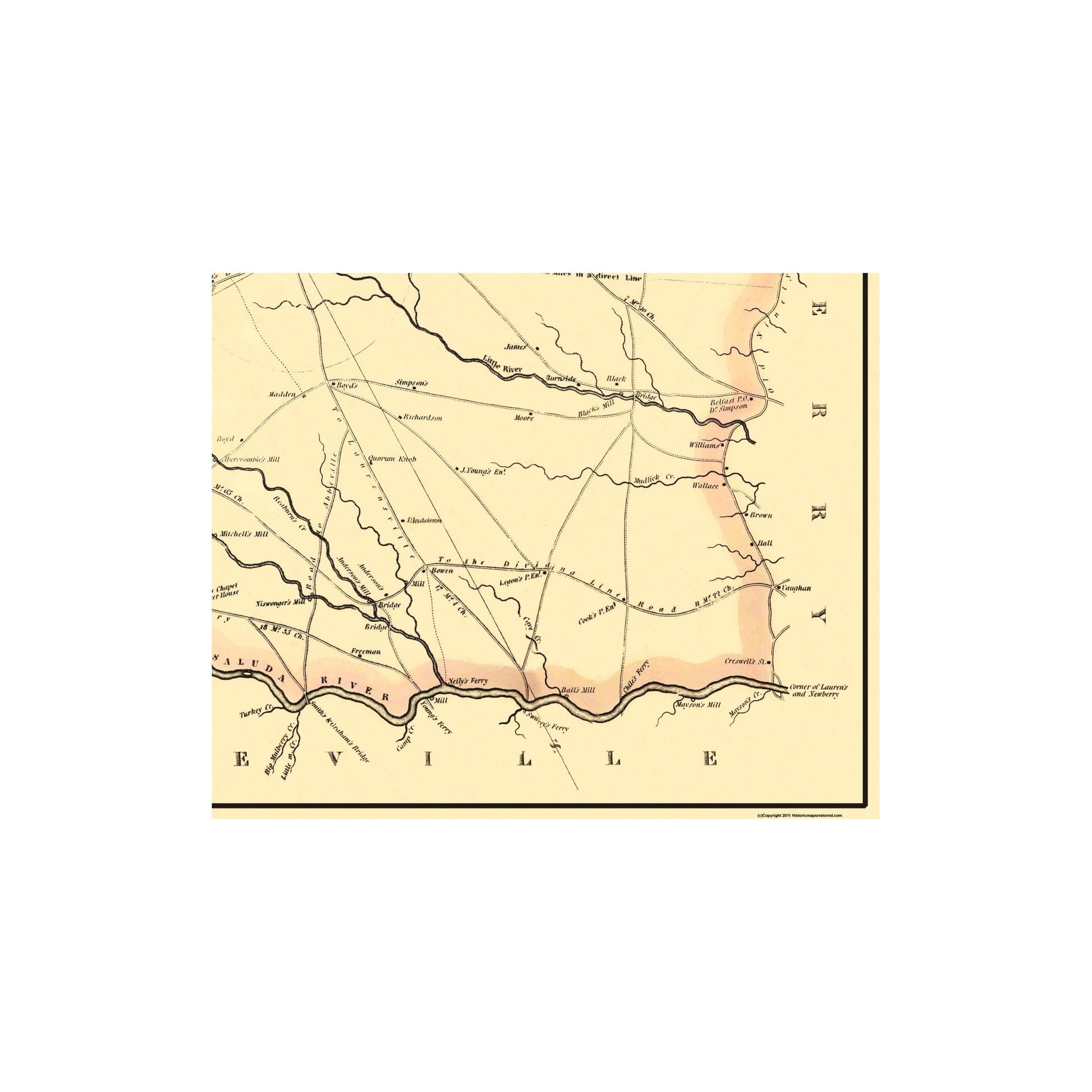 Old County Map - Laurens South Carolina Landowner - Mills 1825 - This is an exquisite full-color Reproduction printed on high-quality gloss paper, art paper or canvas.