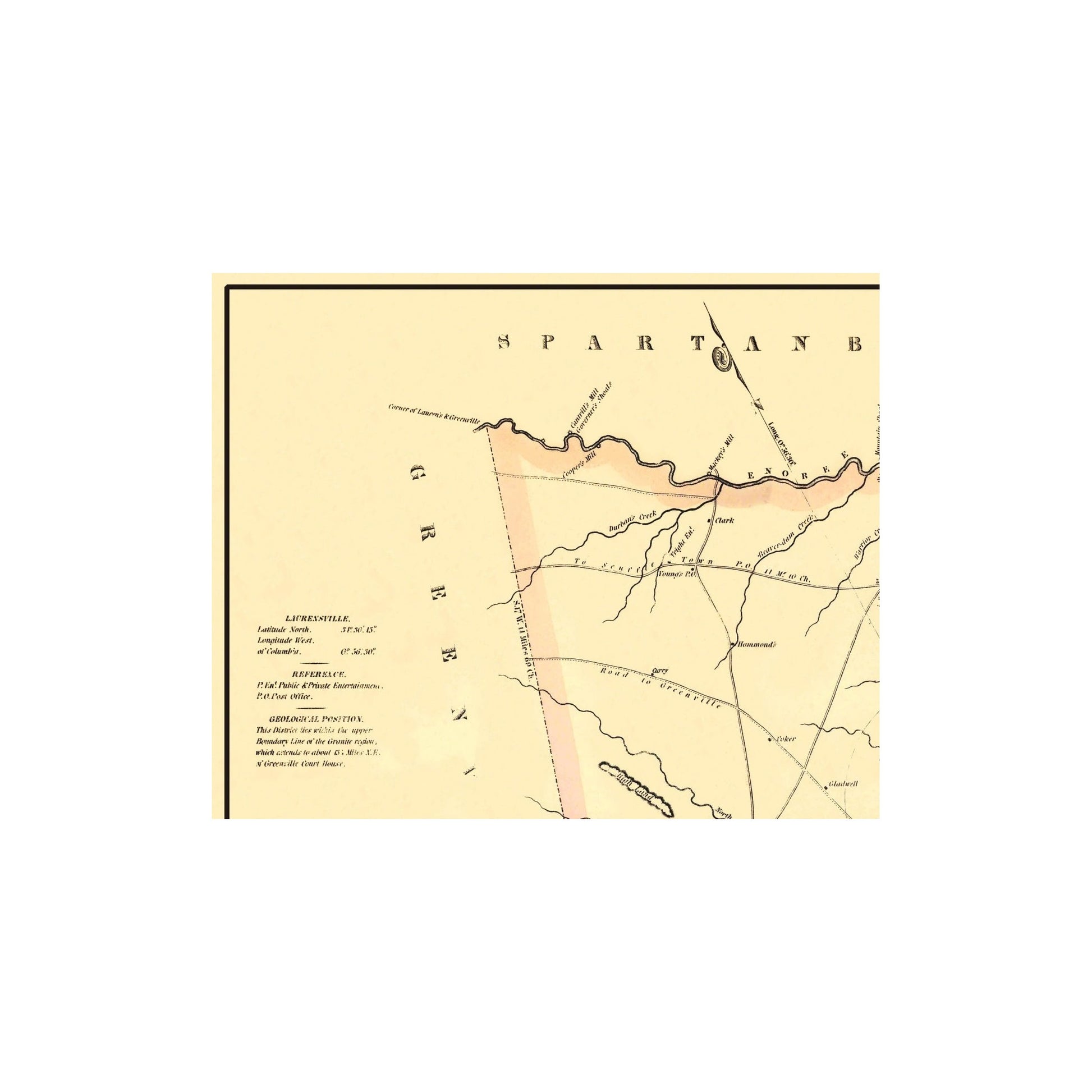 Sites and Townships Specific To This Map Are: Bird's Mountain, Road to Greenville, Enoree River, Bush River, Cave Creek, Churches, Schools, and many other Prominent Buildings.