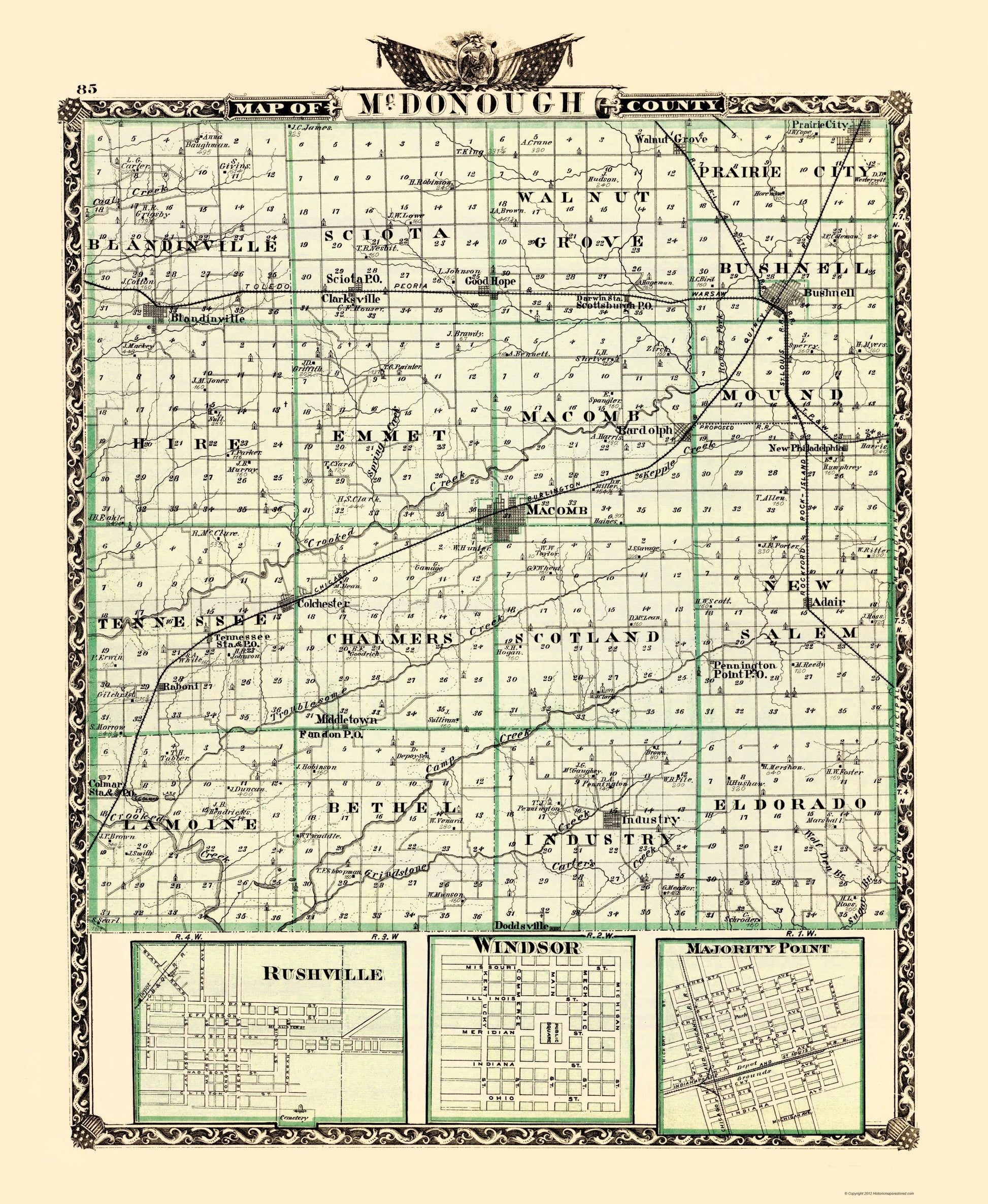 The following towns are featured: insets of Rushville, Windsor, and Majority Point. Rail lines include the Chicago Burlington & Quincy RR, Rock Island & St Louis RR, and the Toledo Peoria & Warsaw Railroad.