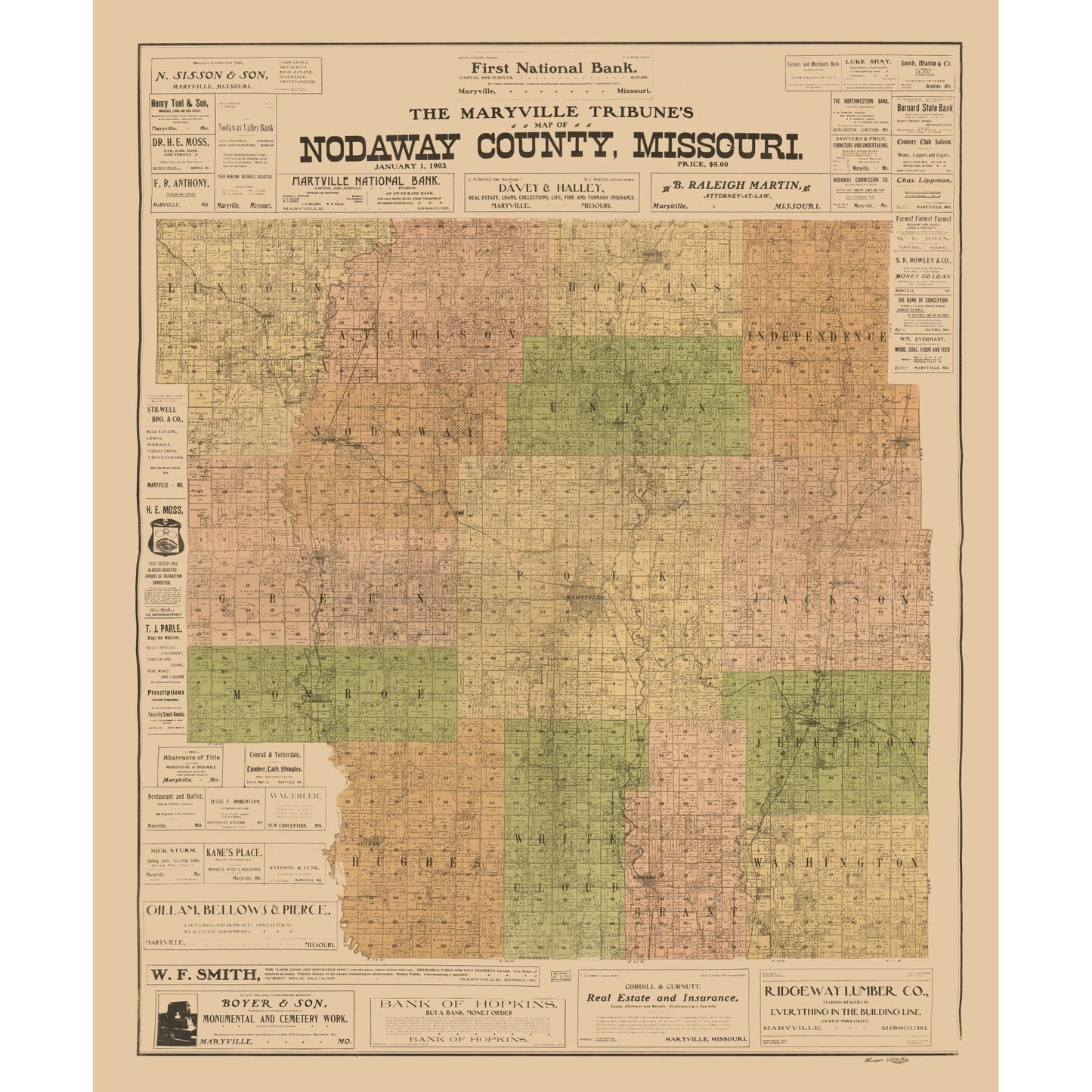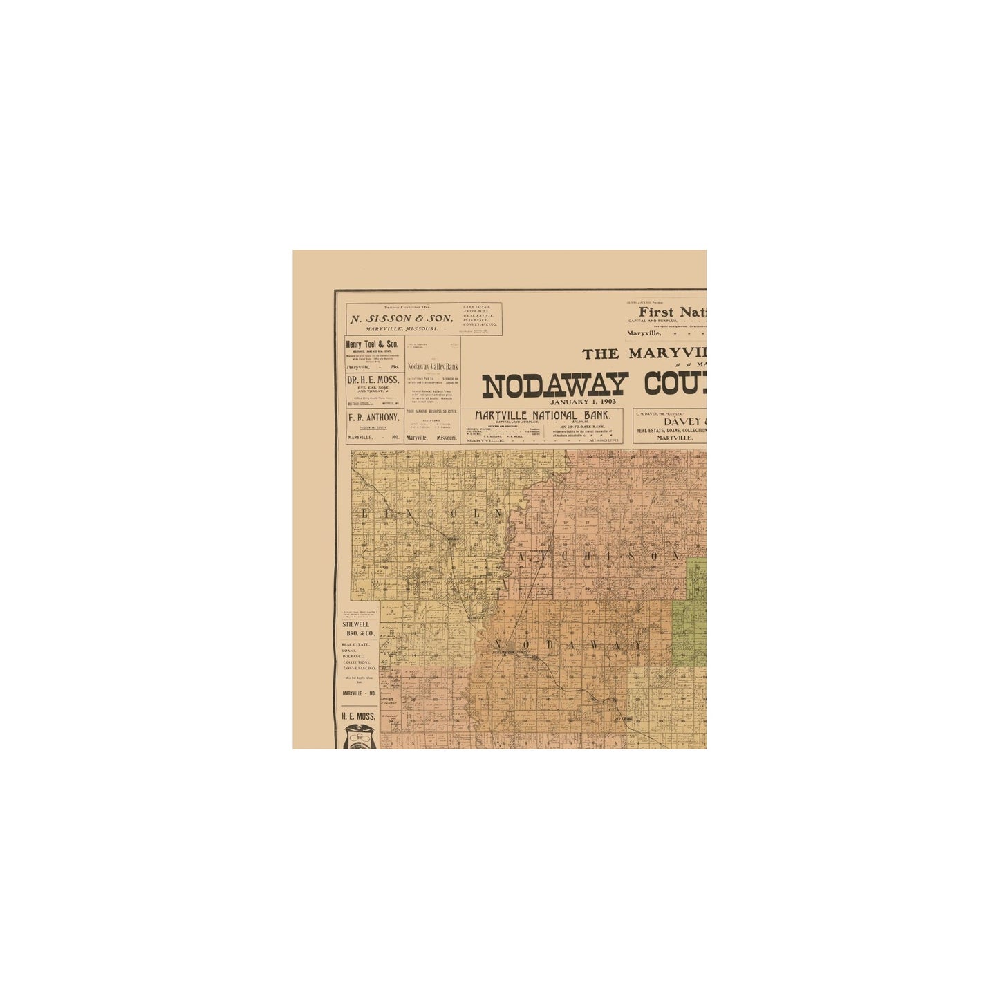 Historic County Map - Nodaway County Missouri - Hixson 1903 - 23 x 27.73 - Vintage Wall Art