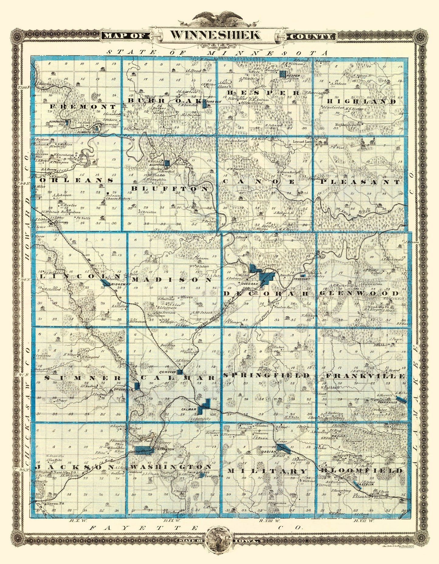 Sites and Townships Specific To This Map Are: Plymouth Rock, Burr Oak, Hesper, Bluffton, Ridgeway, Decorah, Freeport, Spielville, Conover, Calmar, Frankville, Atkinson, Twin Springs, Ossian and Castalia.
