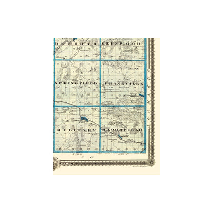 The following towns are featured: Townships include Fremont, Burr Oak, Hesper, Highland, Orleans, Bluffton, Canoe, Pleasant, Lincoln, Madison, Decorah, Glenwood, Sumner, Springfield, Frankville, Jackson, Washington, Military and Bloomfield. Post Offices: Woodville, Locust Lane, Highlandville, Kendallville, New Alba and Navan P.O. Special features include Orleans Cheese Factory, the Iron Bridge, Silver Creek, Ten Mile Creek, Bohemian Creek, Upper Iowa River, Canoe River, Trout River, Turkey River, New Yellow River, M & STP R.R., Decorah Branch M & STB. R.R., M. G. & C.S. R.R., D & STP R.R., R. CR. & M R.R., marsh land, several houses and churches.