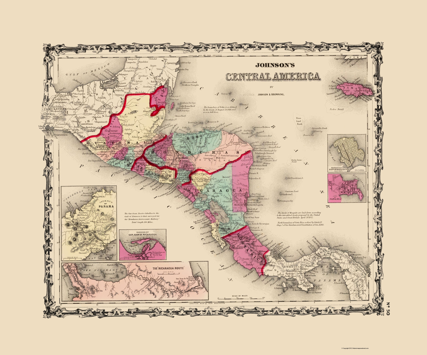 The following towns are featured: Central America in full color by A.J. Johnson. It is an atlas map published in New York in full color. The map includes notes detailing treaties that defined the borders of Belize, Mosquito (in Nicaragua), and the north boundary of Costa Rica.
