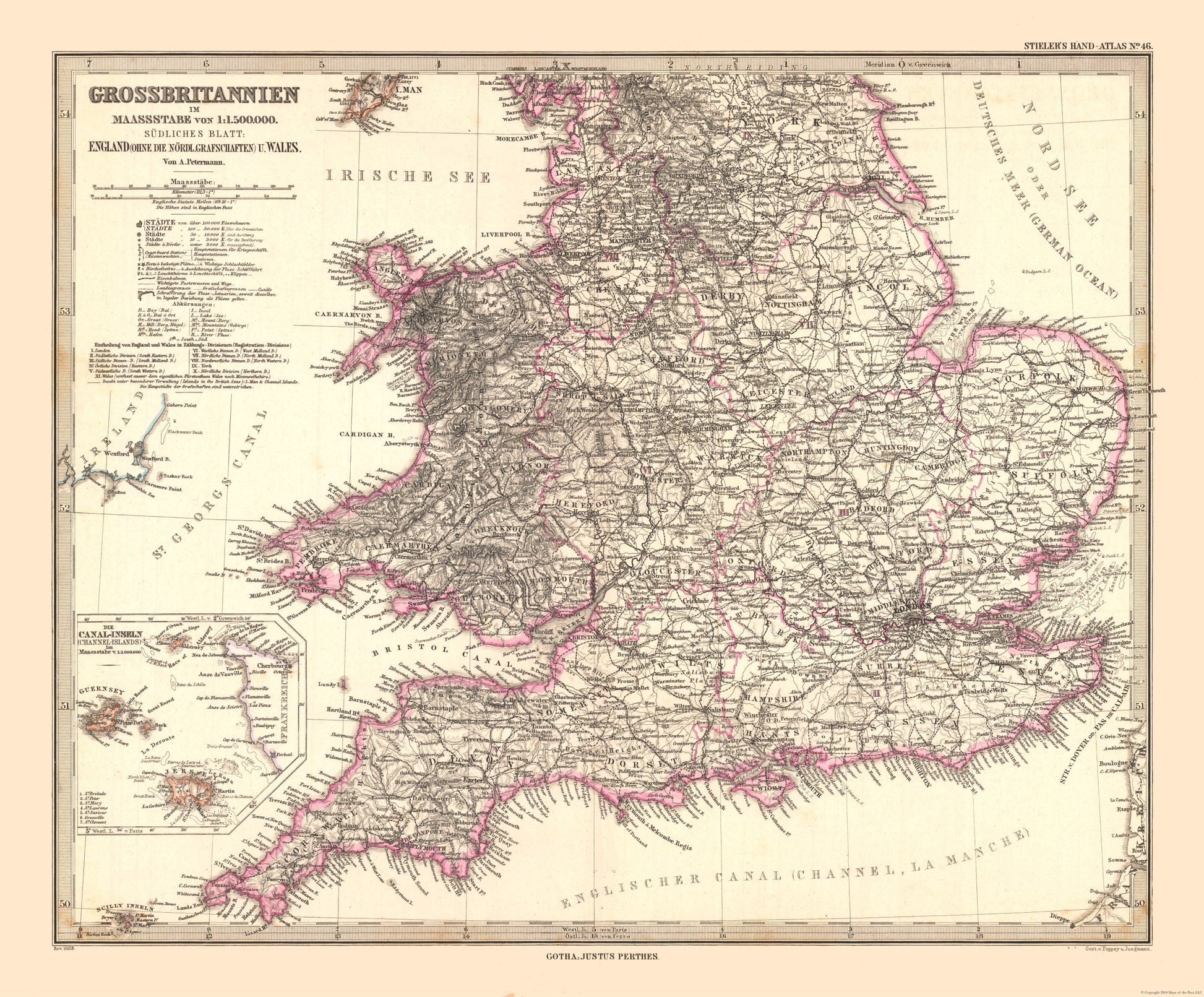 Old International Maps - England and Wales - Stielers 1885 - This is an exquisite full-color Reproduction printed on high-quality gloss paper, art paper or canvas.
