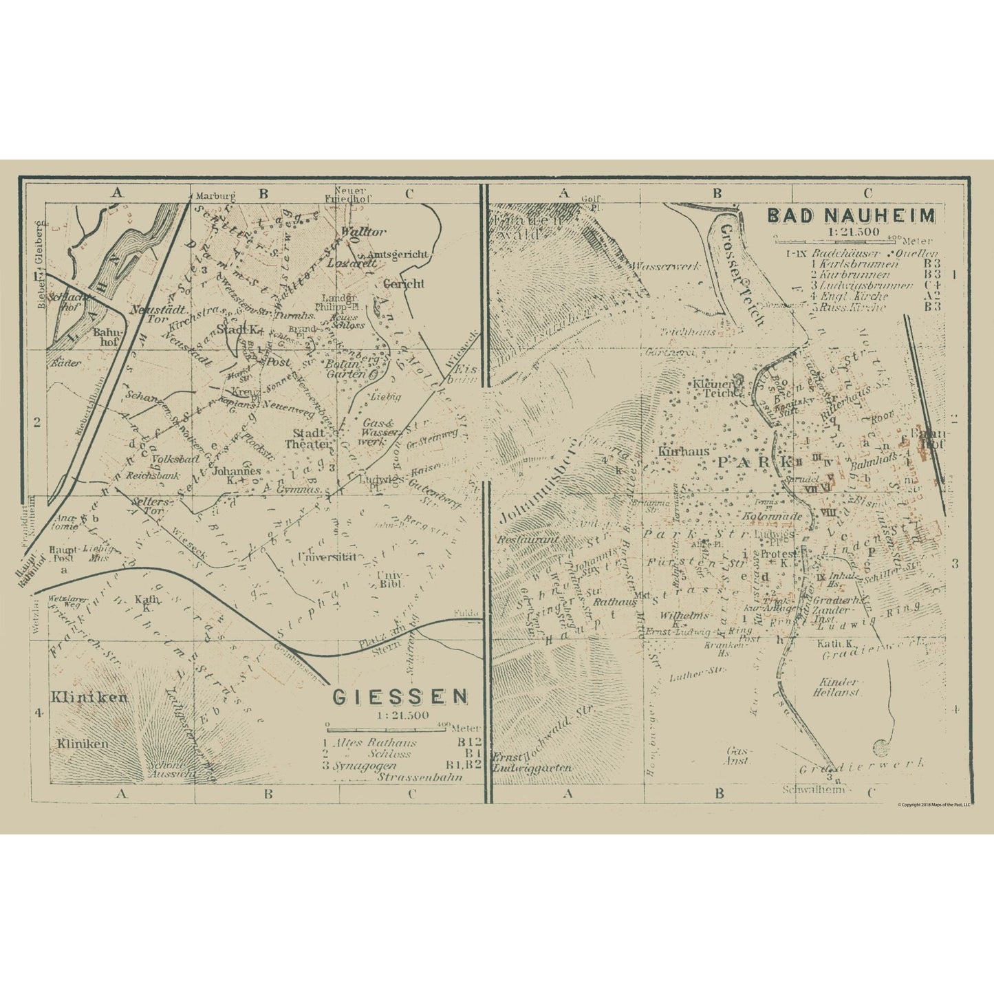 Old International Maps - Giessen - Bad Nauheim - Germany - Baedeker 1914 - This is an exquisite full-color Reproduction printed on high-quality gloss paper, art paper or canvas.