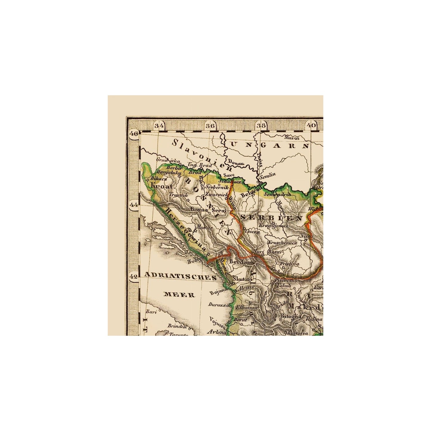 The following towns are featured: an engraved map of Turkey and Greece by J. L. Brudin and Adolf Stieler. It has outline hand coloring and is labeled in German. Relief is shown in hachures, with a prime meridian of Ferro.