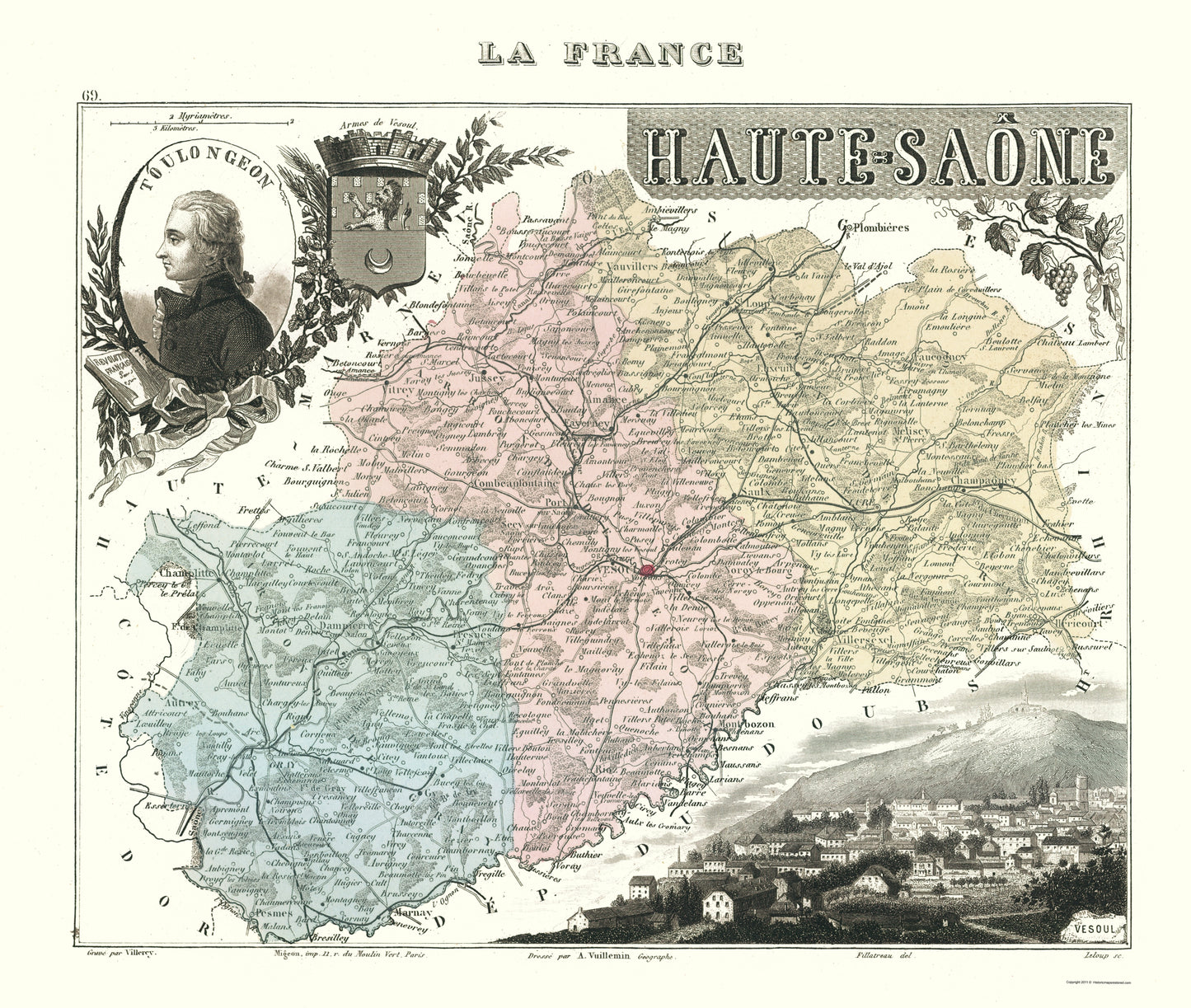 The following towns are featured: Colored with vignettes of local scenes, coats of arms, personages, animals, people, and crops. The map was authored by A Vuillemin and J Migeon and engraved by Ales and Isidore in 1869, Paris. Haute-Saone is a French department of the Franche-Comte region named after the Saone River.