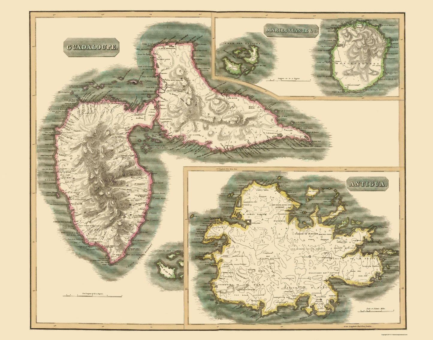Old Caribbean Map - Guadeloupe, Mariegalante and Antigua 1815 - This is an exquisite full-color Reproduction printed on high-quality gloss paper, art paper or canvas.