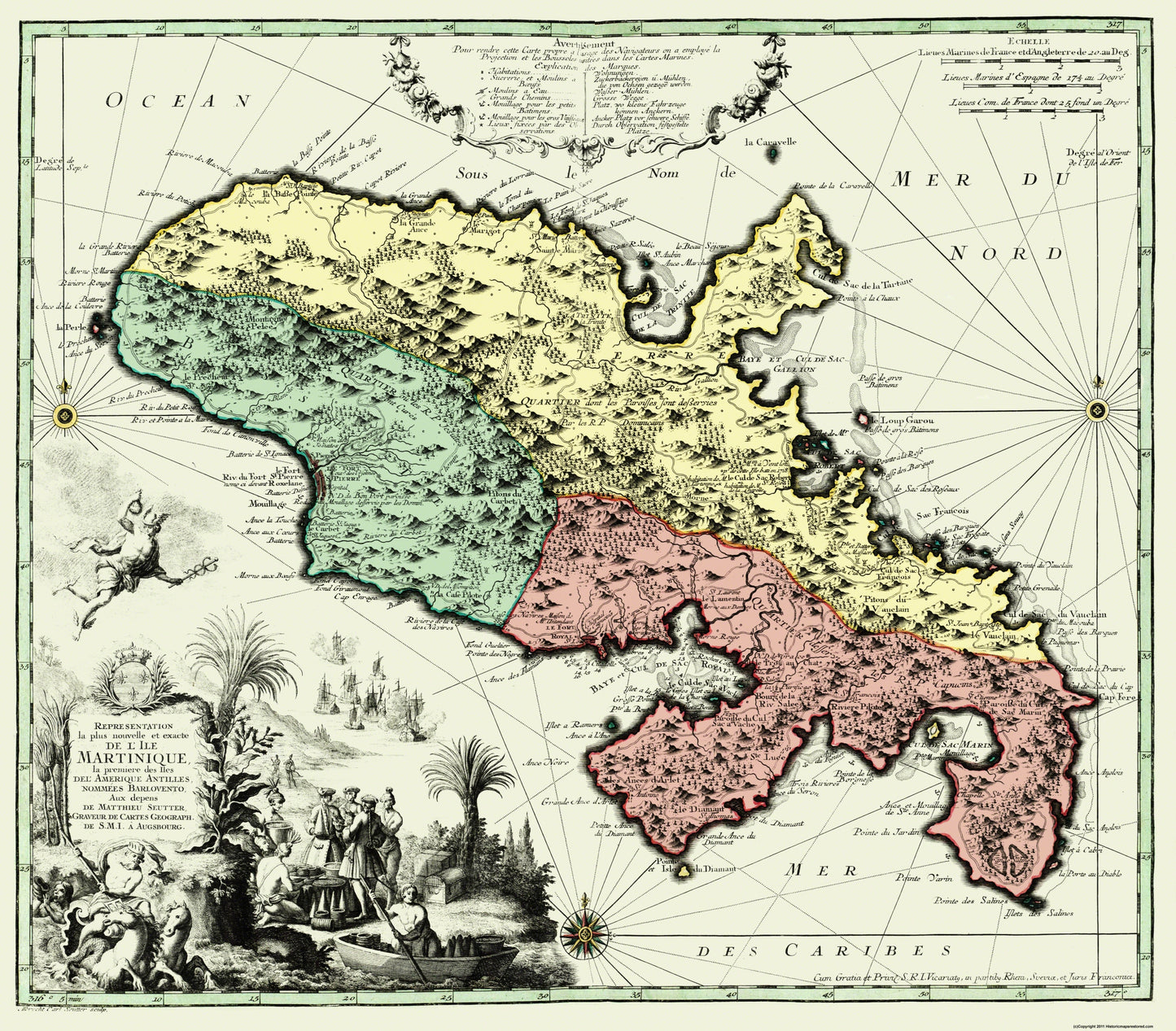 Sites and Townships Specific To This Map Are: This fine attractive map depicts the island of Martinique that is divided into three religious areas: The Pink denotes Jesuit occupation, Yellow denotes Dominicans, and the green pertains to Franciscan Order. The large cartouche in the left hand corner illustrates the natives who live on the island and European traders. Other decor shows mercury above neptune in the sea and naval engagement. This map is from an original engraved map with hand coloring.