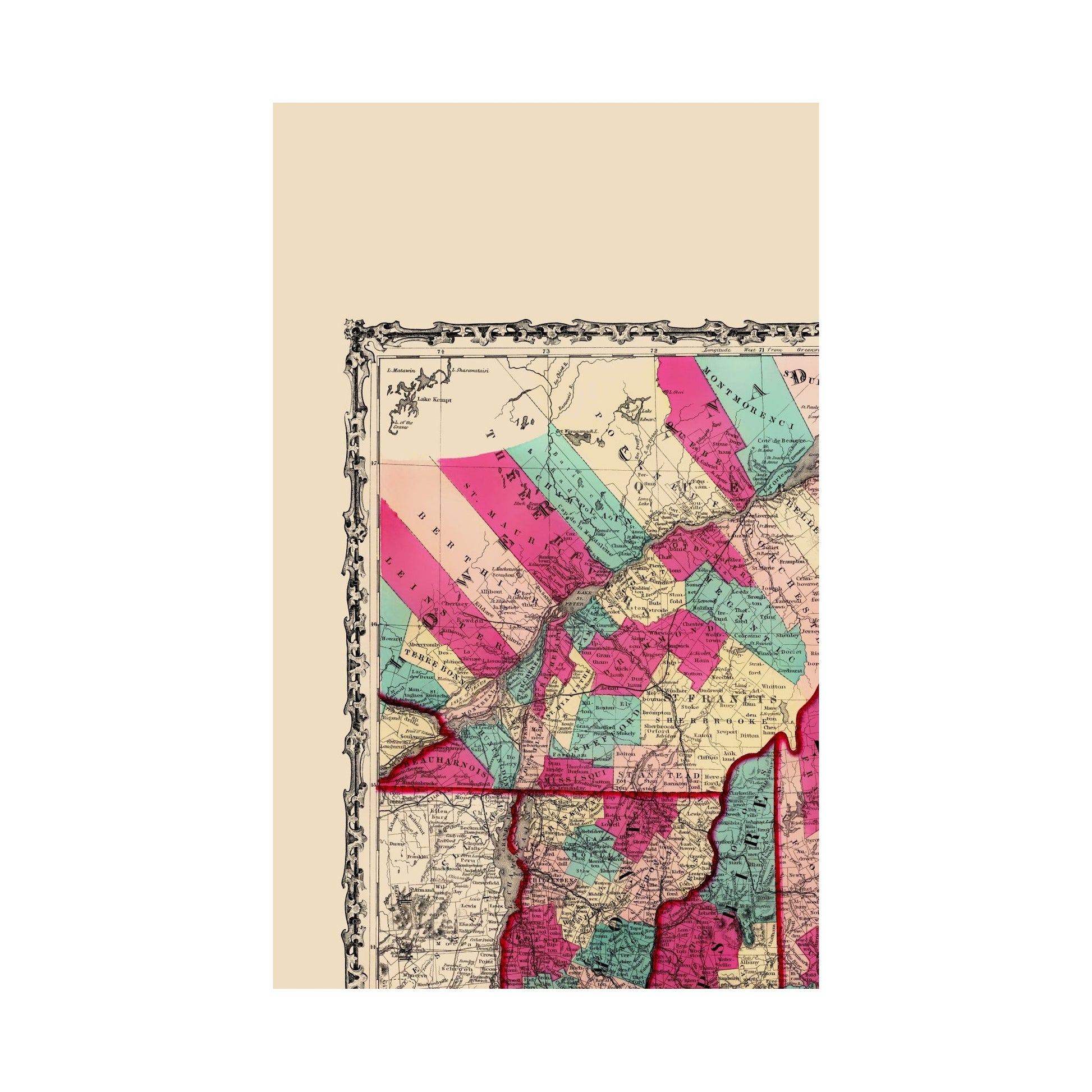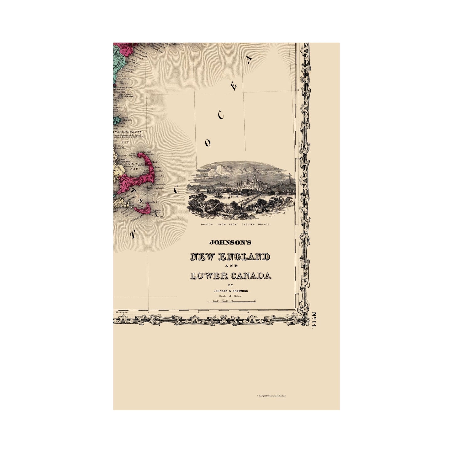Old North America Map - New England and Lower Canada - Johnson 1860 - This is an exquisite full-color Reproduction printed on high-quality gloss paper, art paper or canvas.