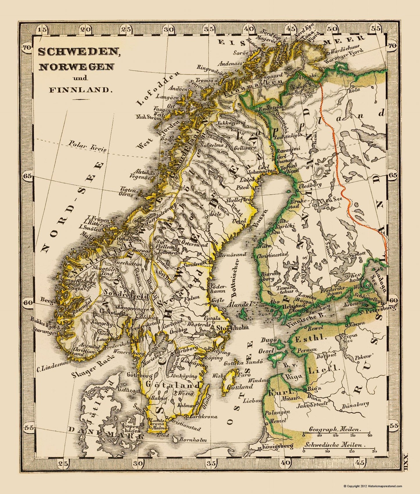 Old Scandinavia Map - Norway, Sweden, Finland - Stieler 1852 - This is an exquisite full-color Reproduction printed on high-quality gloss paper, art paper or canvas.