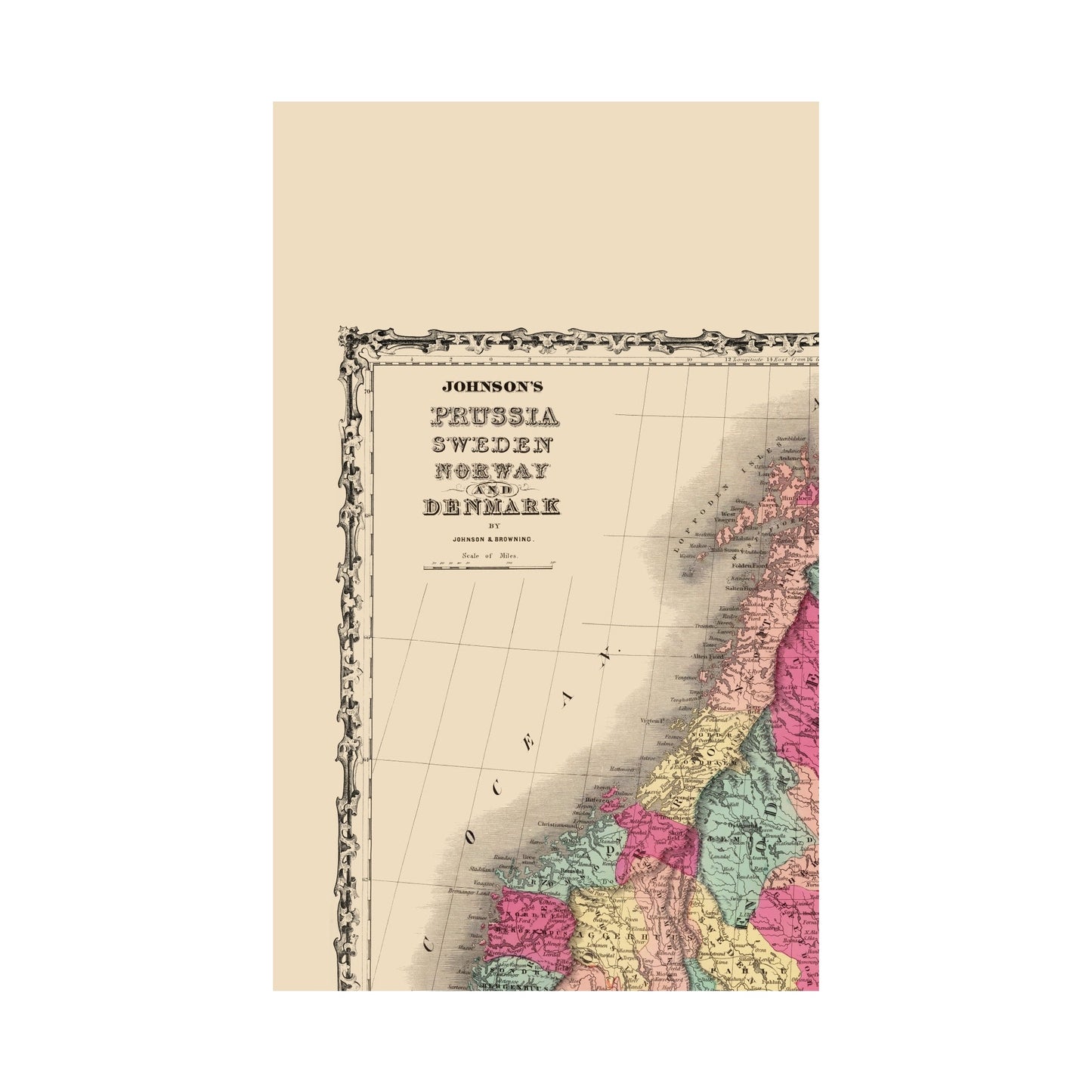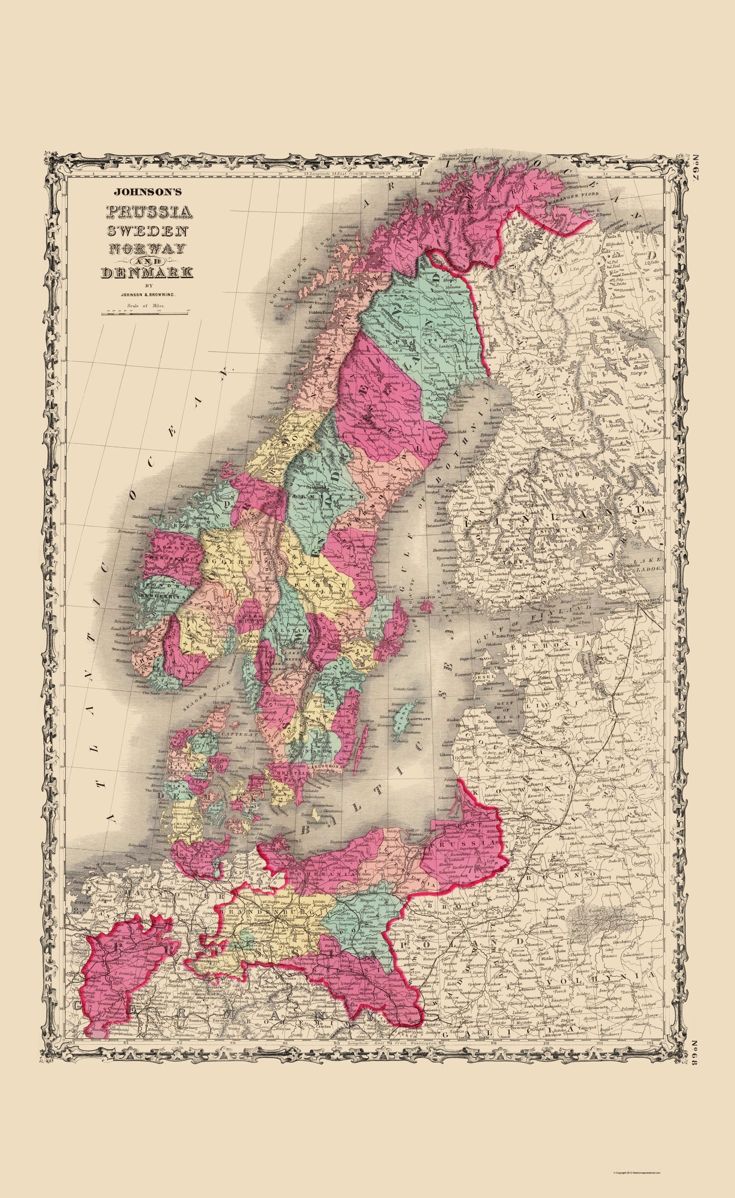 Old Scandinavia Map - Prussia, Sweden, Norway, Denmark - Johnson 1860 - This is an exquisite full-color Reproduction printed on high-quality gloss paper, art paper or canvas.