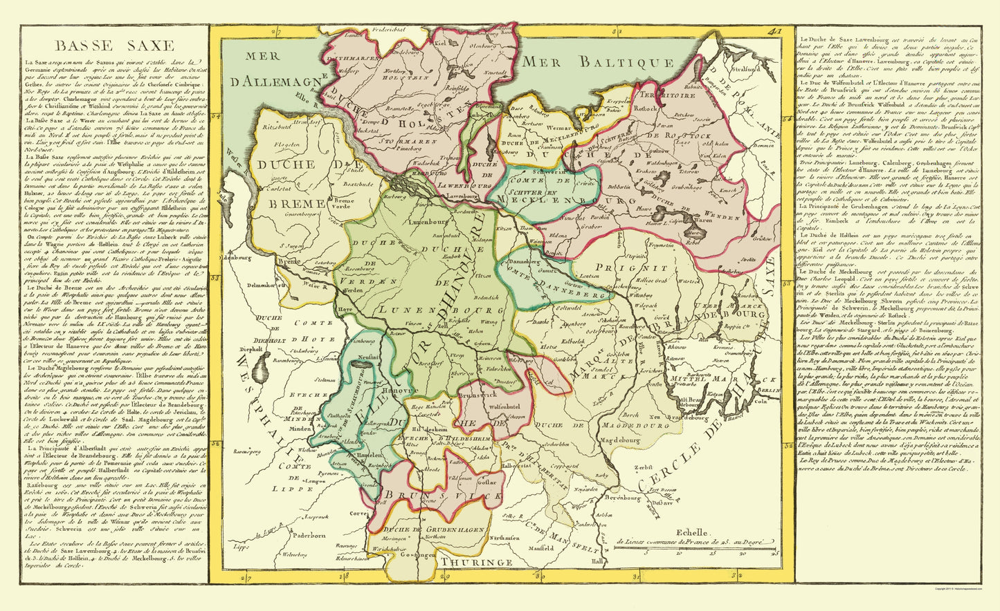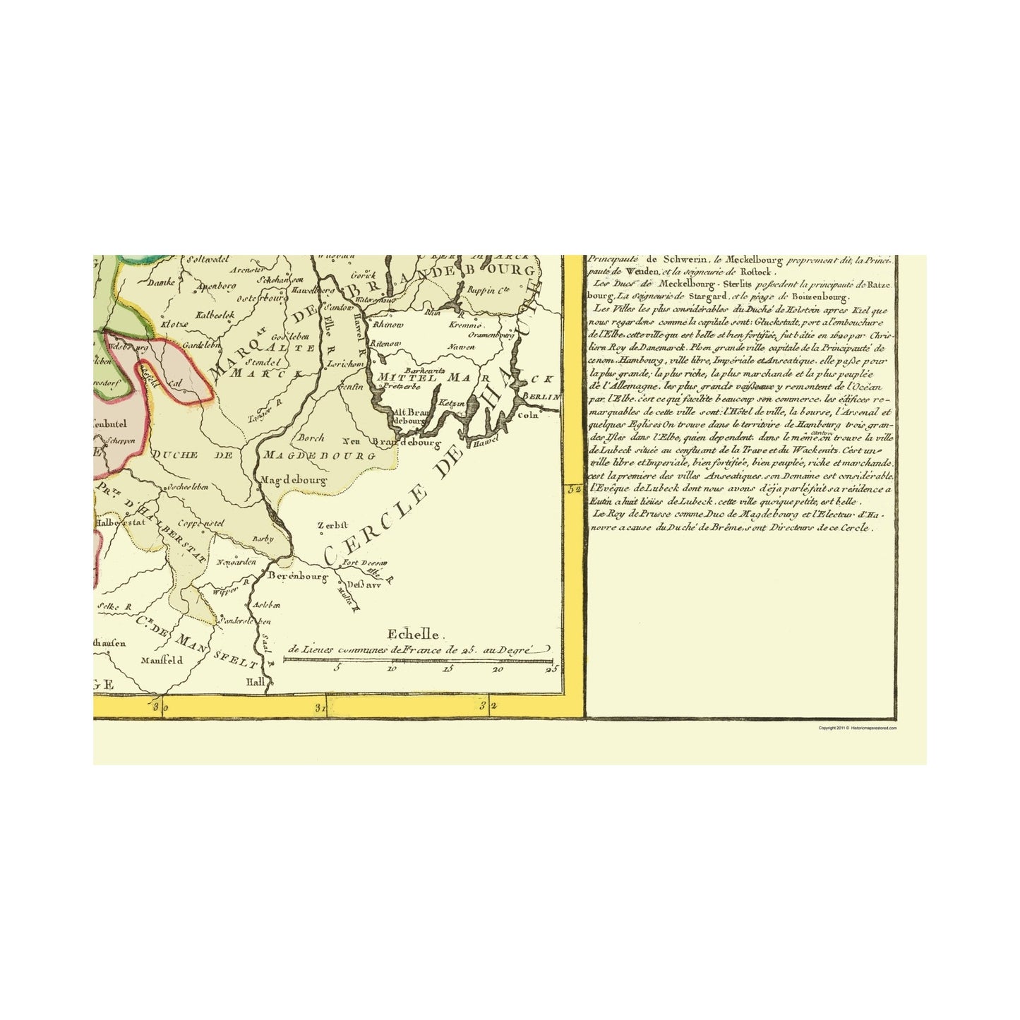 The following towns are featured: engraved map with detailed text description. The map is hand colored and covers duchies of Bremen, Holstein, Mecklenburg, Brunswick, Grubenhagen, Magdeburg, Brandenburg, the Electorate of Hanover and counties of Mecklenburg, Danneburg, Mansfeld, and surroundings. The prime meridian is Ferro.