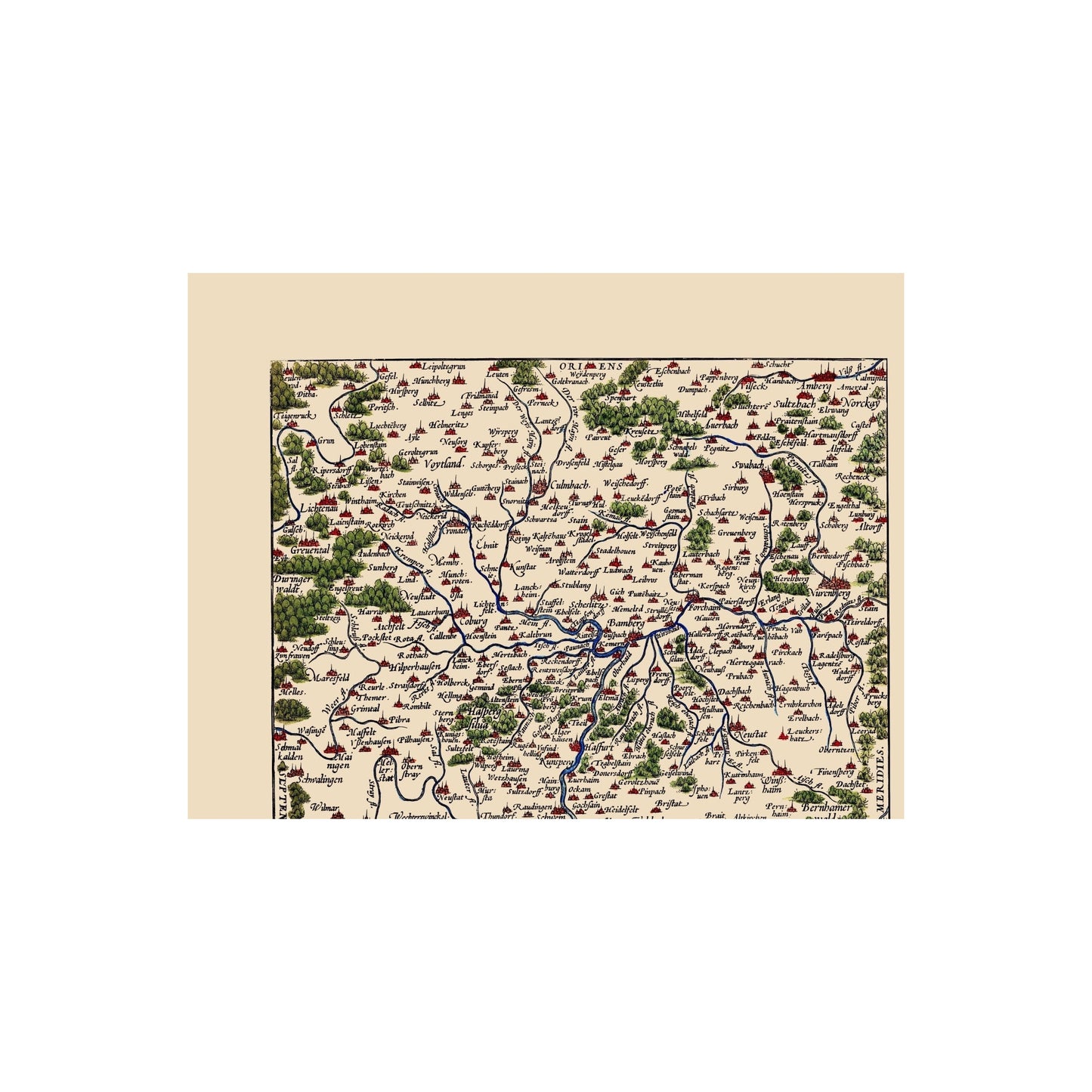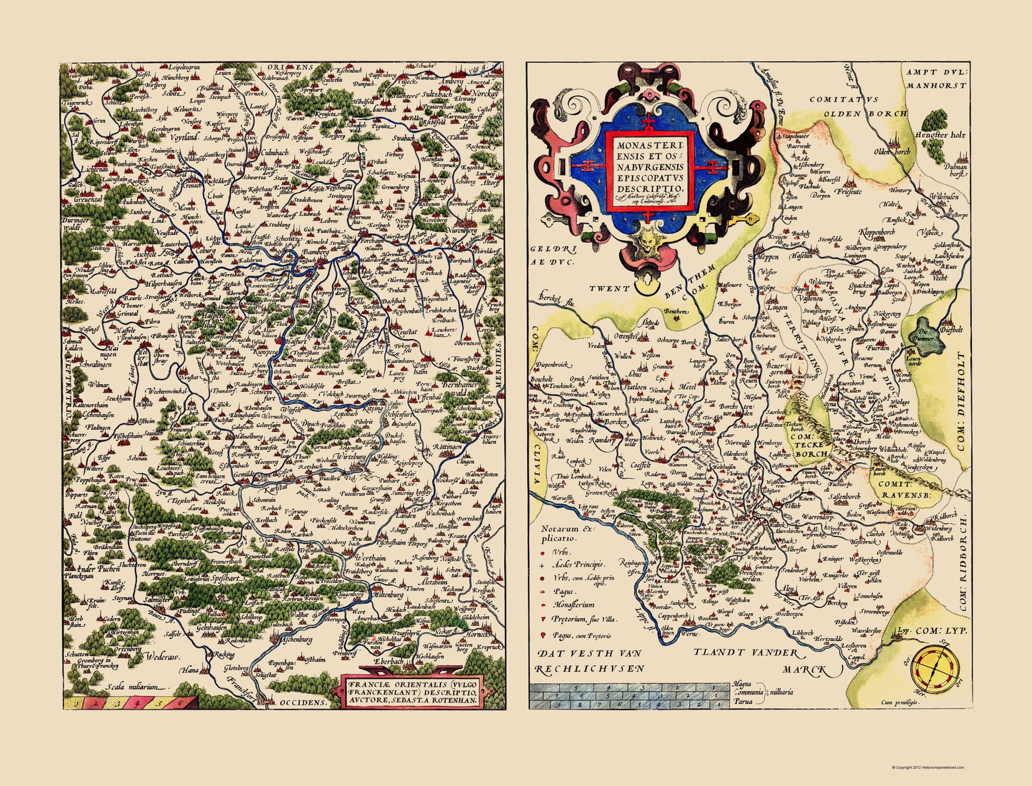 The following towns are featured: two maps of German regions on one sheet. The map of Bavaria covers the Main River valley. The detailed map is oriented with north to the left and Frankfurt am Main is located at the bottom. The map was based on the cartography of Sebastian Rotenhan. The right map illustrates the region of Lower Saxony and North Rhein-Westphalia with the cities of Meppen, Munster and Osnabruck. It was derived from a map made by Godfried Mascop.