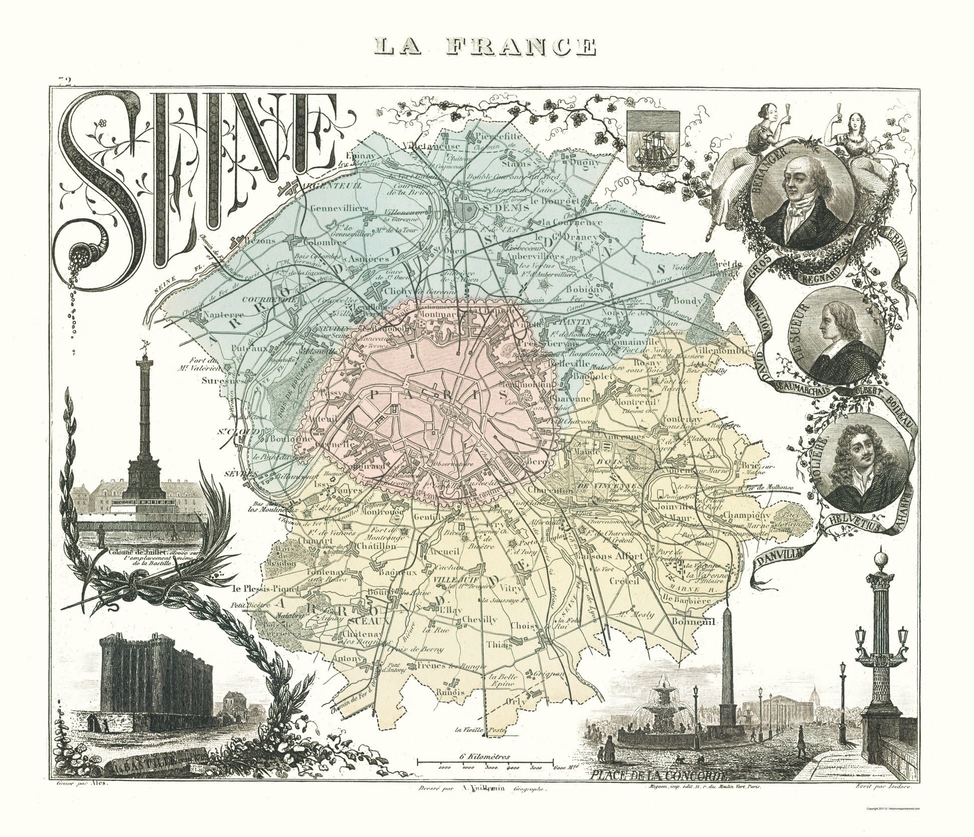 The following towns are featured: Colored with vignettes of local scenes, coats of arms, personages, animals, people, and crops. The map was authored by A Vuillemin and J Migeon and engraved by Ales and Isidore in 1869, Paris. Seine was a department of France encompassing Paris and its immediate suburbs. Its capital was Paris and its official number was 75. The Seine department was abolished in 1968 and its territory divided among four new departments.