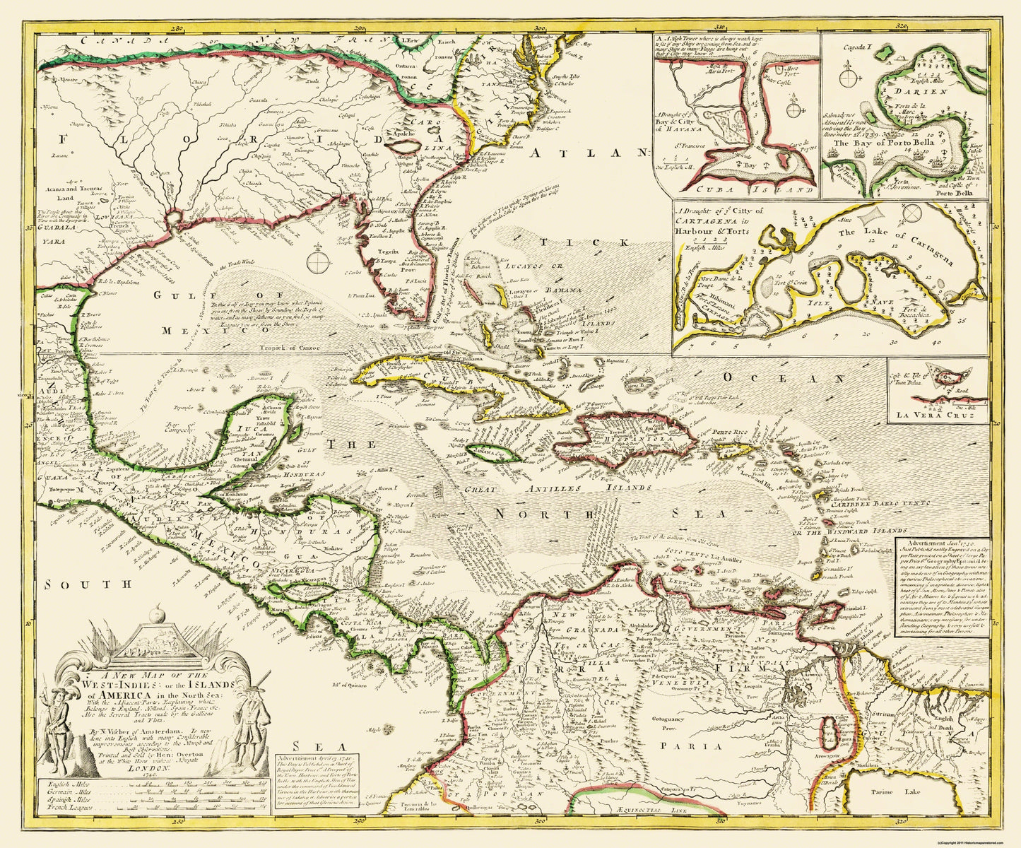 The following towns are featured: Descriptive map showing the caribbean and gulf coast region, from Florida to South America. Inserts include the Ports of Cartagena, Havana, and Porto Bella. A new map of the West Indies: or the Islands of America in the North Sea - with adjacent parts, explaining what belongs to England, Holland, Spain, France, and also several tracks made by the Galleons and Flota.