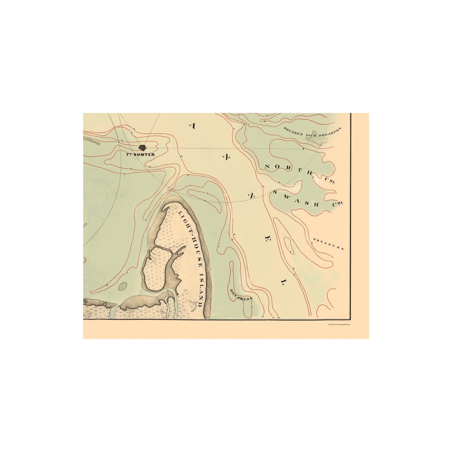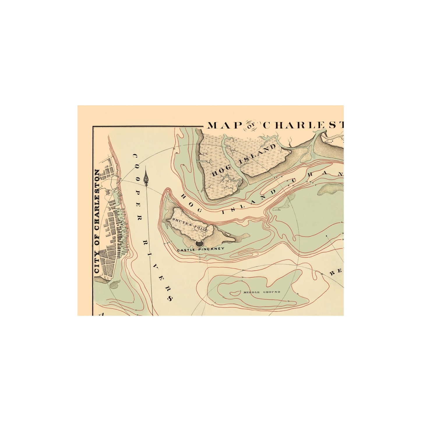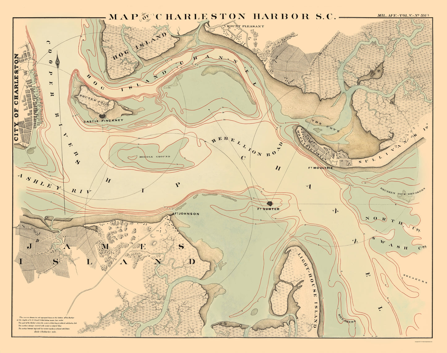 The following towns are featured: Detailed plan of the Charleston Harbor, from Volume 5 of the American State Papers. Depths are outlined in red. The map extends from Sullivan Island to the City of Charleston and from Lighthouse and James Island to Hog Island and Mount Pleasant. Excellent large format map.