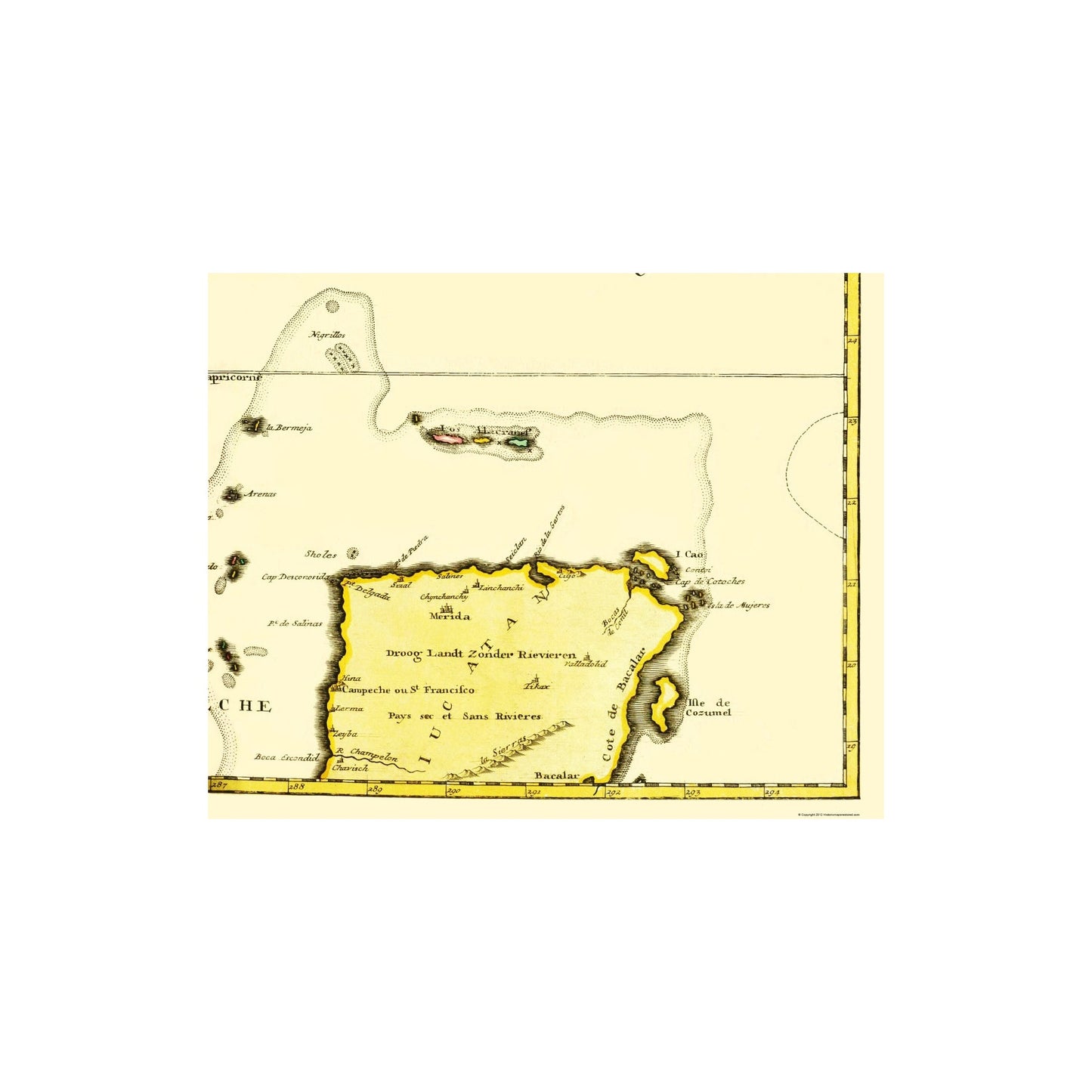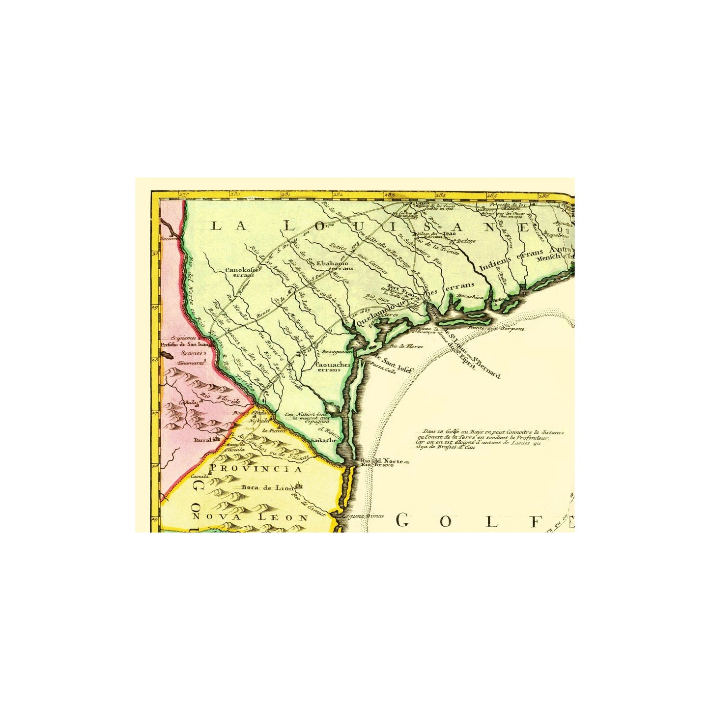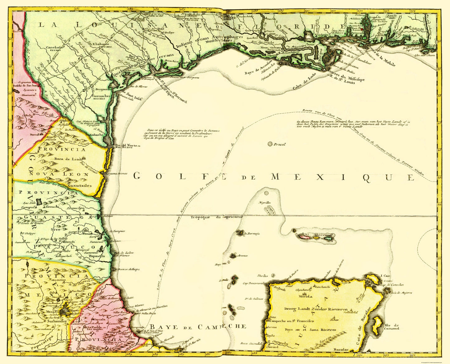 The following towns are featured: French map. This encompasses the Gulf of Mexico Coast from Pensacola Bay to the Mexican Yucatan Peninsula. Land routes are included, along with voyage routes across the Gulf to Vera Cruz Mexico.