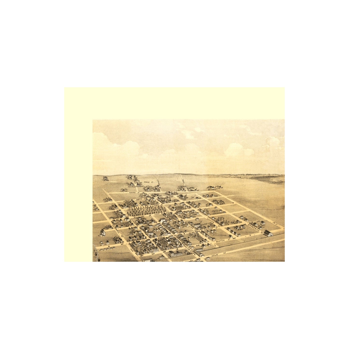 The following towns are featured: a Bird's Eye View of the city with clearly labeled streets. The local railroad is shown in the central portion of the map.