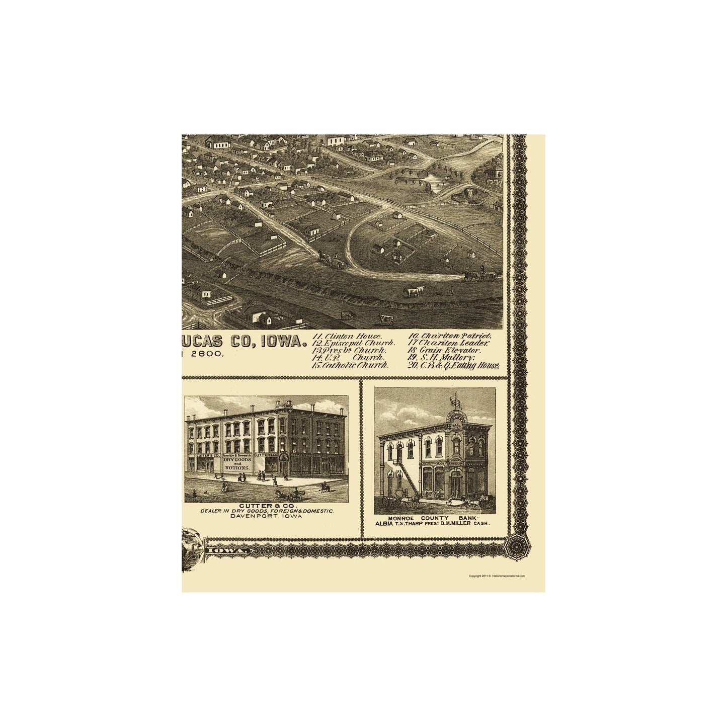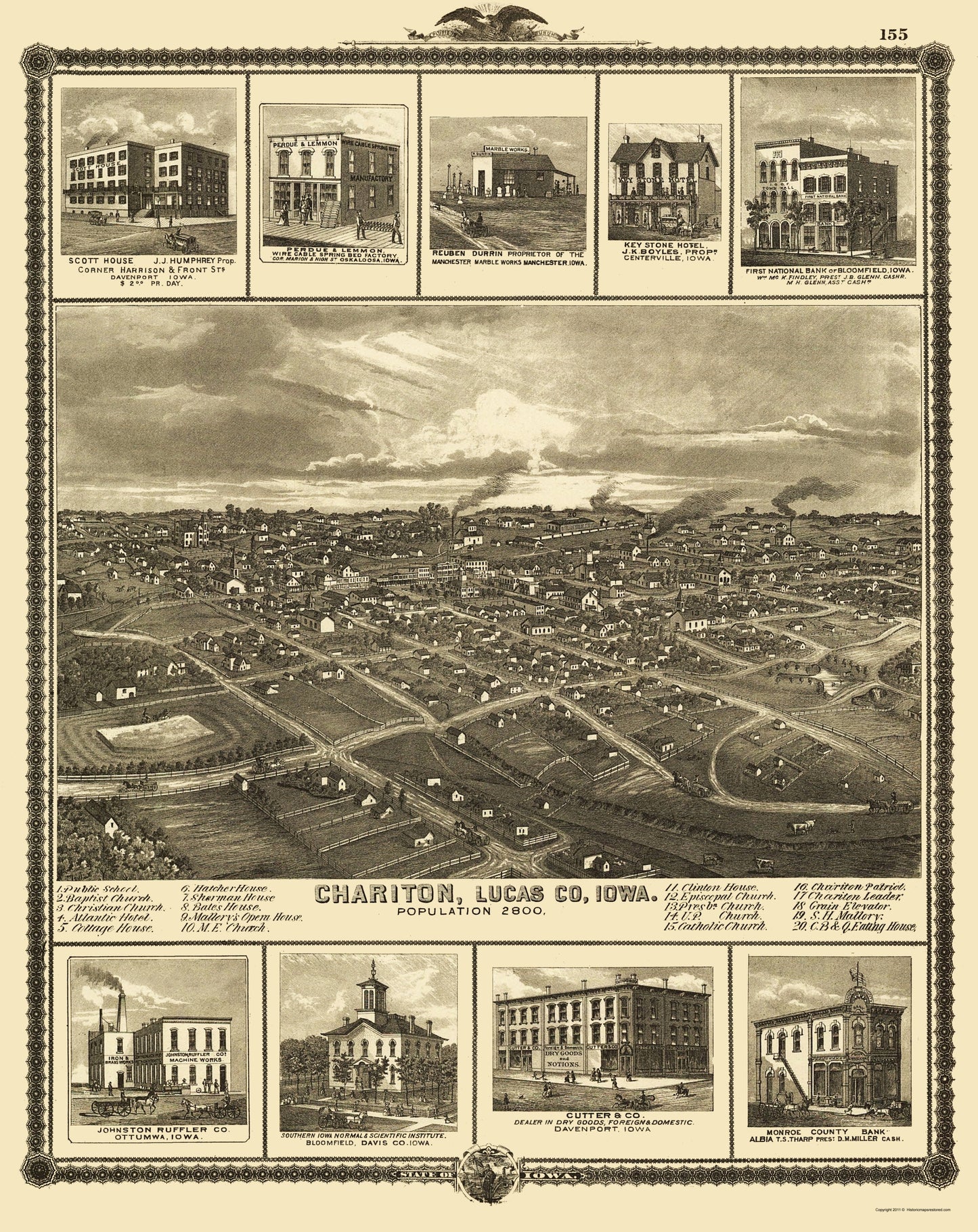 The following towns are featured: Chariton, Iowa from a Bird's Eye View. A numerical table indicates schools, churches, hotels, houses, residences, and businesses. Artist renderings on the top and bottom border include Johnston Ruffler Co, Southern Iowa Normal & Scientific Institute, Cutter & Co, Monroe County Bank, First National Bank, Key Stone Hotel, Manchester Marble Works, Perdue & Lemmon Wire Cable Spring Bed Factory, and Scott House.