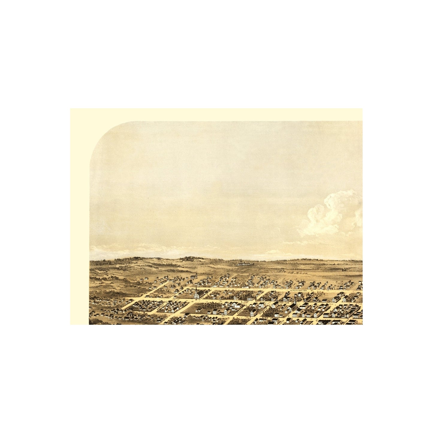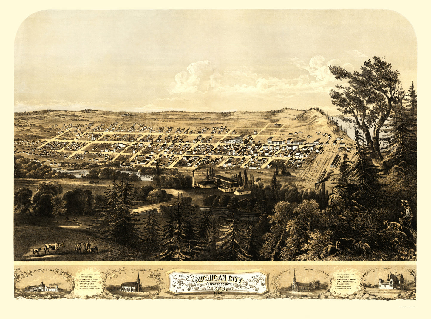 The following towns are featured: This beautiful panoramic of Michigan City, Indiana shows the city in a highly majestic light, while also detailing all important features. Notable features include: Catholic Sister's School, public school, German Lutheran School, numerous churches, Haskell & Barker's Car Works. L.N.A.&C.R.R. Round House and Machine House and Northern Indiana Prison. Along the bottom of the map are four insets of the Northern Indiana Prison, Catholic Church, Episcopal Church and a local homestead.