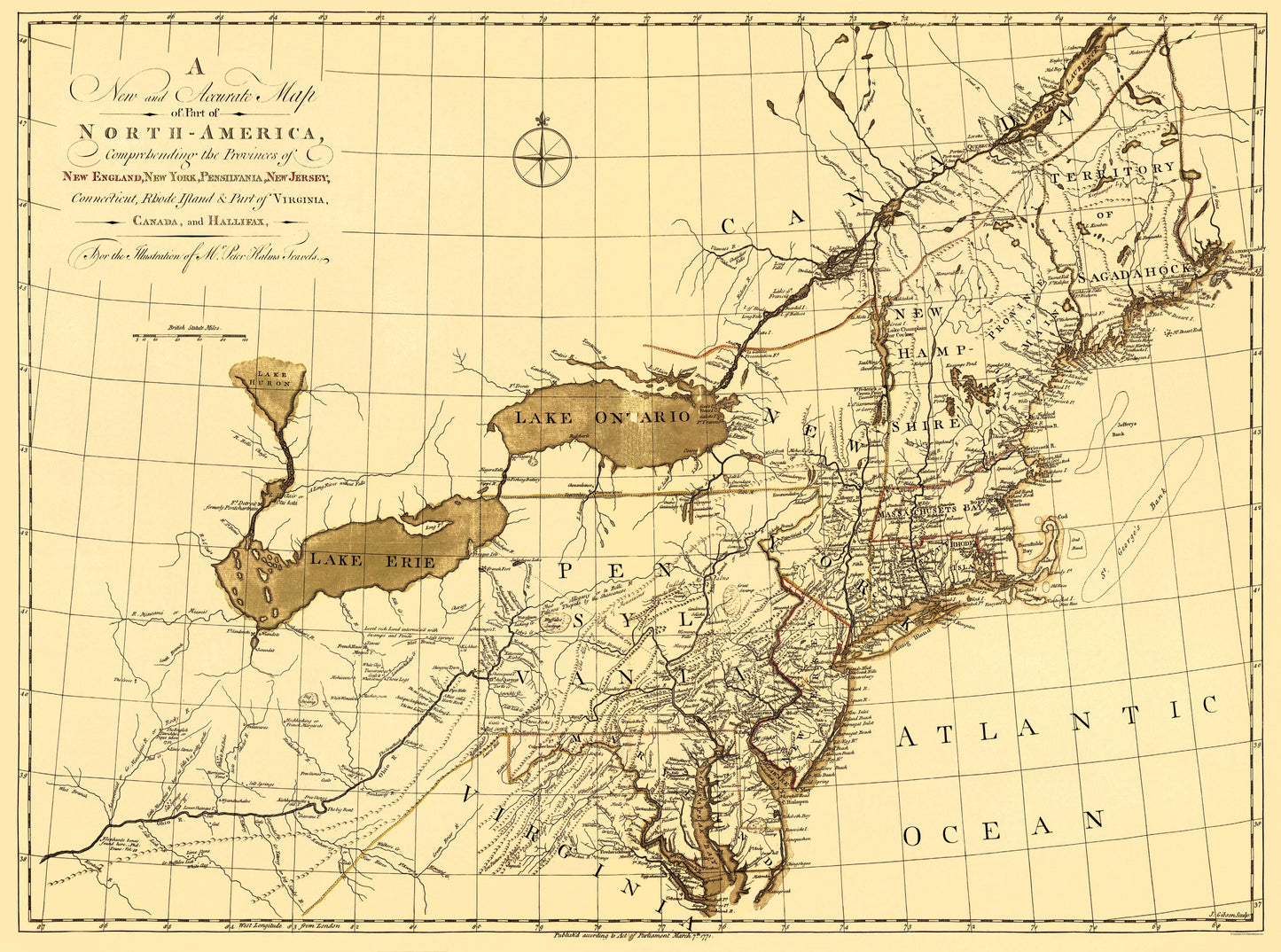 The following towns are featured: Pennsylvania, Virginia, Lake Erie, Lake Ontario, Lake Huron, Lake Erie, New Hampshire, New York, Territory of Sagadahoc, Ohio River, Kennebeck River, Susquehana River, Hudson River, Connecticut River, Potowmack River, Province of Maine, Massachusetts Bay, Rhode Island, Chesapeake Bay, and Delaware Bay.