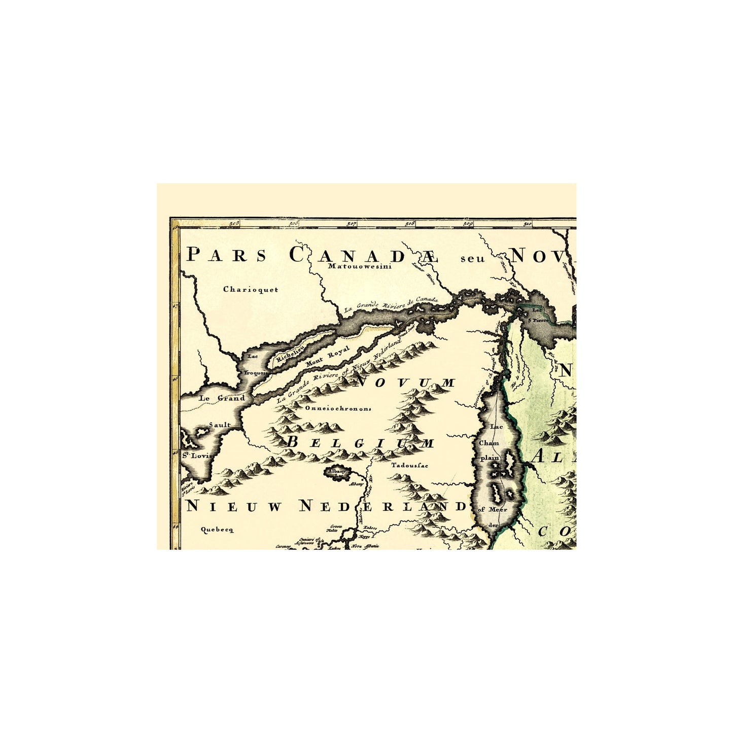 The following towns are featured: Colorful map written in Italian of New England, New France, New Belgium, New Netherlands, New York, East New Jersey, West New Jersey, Long Island, St. George Channel, Lake Champlain, and the North Sea.