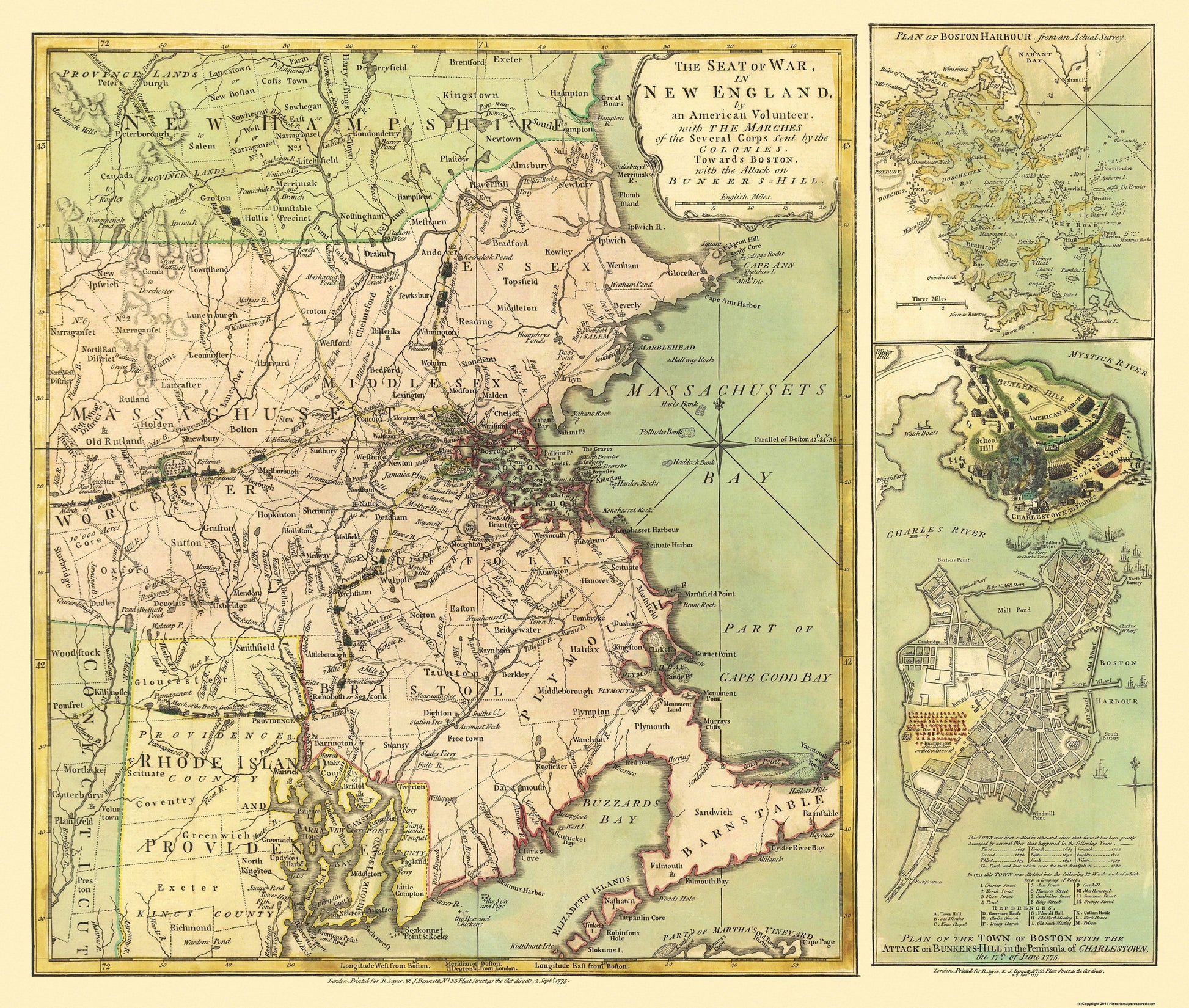 The following towns are featured: The Seat of War in New England between the American Citizenry and the British Crown showing the states of New Hampshire, Massachusetts, Rhode Island, Connecticut. Plan of the Boston Harbor Plan of the town of Boston with the attack on Bunker Hill in the Peninsula of Charleston Illustrating the march of General Washington through Worcester County towards Concord with the New York Grenadiers as well as Virginia horse and riflemen. The march of New Hampshire troops and provisional wagon train and troops from Providence, The Rangers from New Hampshire.