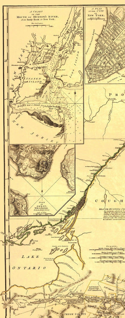 The following towns are featured: Counties, Delaware Bay, Cape May, Delaware River, Kittany Mountain, Cusbetunk Mountains, The Great Swamp, Endless Mountains, Blue Mountains, Susquehanna River, River St. Laurence or Cadaraghkui, Oneyda Lake, Lake Ontario and Beaver Hunting Country of the Confederate Indians. This map also includes inserts of Plan of Amboy; Chart of the Mouth of Hudson's River, from Sandy Hook to New York; Plan of the City of New York,